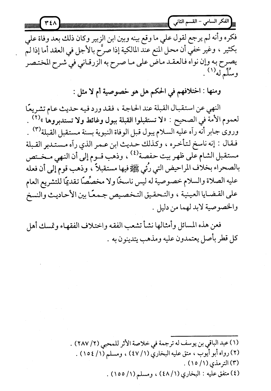 فقال: إنه ناسخ لتأخره، وكذلك حديث ابن عمر الذي رآه مستدبر القبلة مستقبل الشام, عليه ظهر بيت حفصة4، وذهب قوم إلى أن النهي مختص بالصحراء, بخلاف المراحيض التي رئي -صلى الله عليه وسلم- فيها مستقبلًا، وذهب قوم إلى أن فعله -عليه الصلاة والسلام- خصوصية له ليس ناسخًا، ولا مخصصًا, تقديمًا للتشريع العام على القضايا العينية، والتحقيق التخصيص جمعًا بين الأحاديث والنسخ والخصوصية لا بُدَّ لهما من دليل.