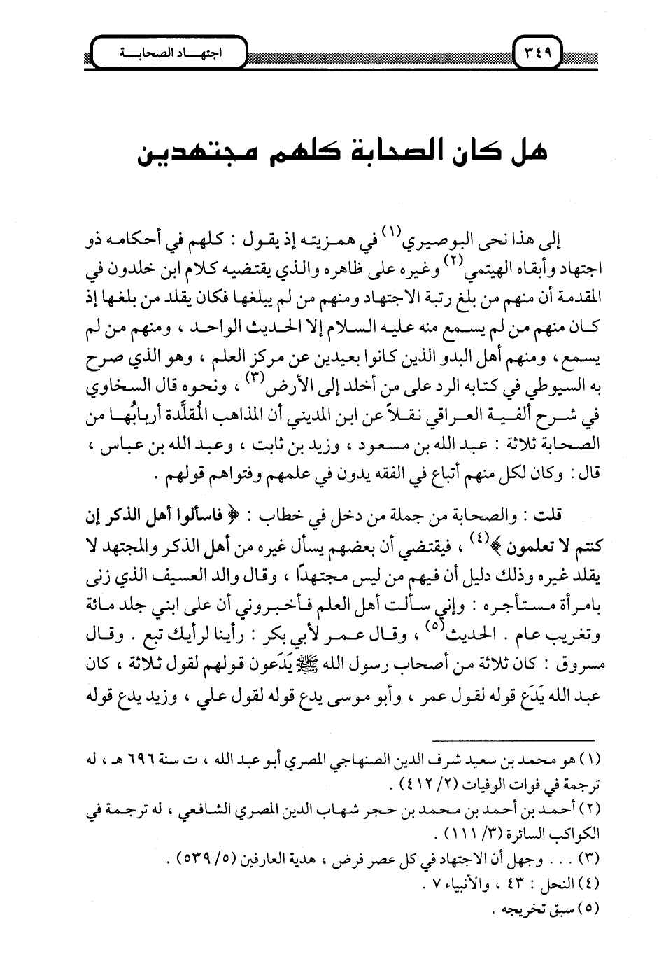 إلى هذا نحى البوصيري1 في همزيته إذا يقول: كلهم في أحكامه ذو اجتهاد, وأبقاه الهيتمي2 وغيره على ظاهره, والذي يقتضيه كلام ابن خلدون في المقدمة, أن منهم من بلغ رتبة الاجتهاد ومنهم من لم يبلغها, فكان يقلد من بلغها؛ إذ كان منهم من لم يسمع منه -عليه السلام- إلّا الحديث الواحد، ومنهم من لم يسمع، ومنهم أهل البدو الذين كانوا بعيدين عن مركز العلم، وهو الذي صرّح به السيوطي في كتابه الرد على من أخلد إلى الأرض3، ونحوه قال السخاوي في شرح ألفية العراقي, نقلًا عن ابن المديني أن المذاهب المقلدة أربابها من الصحابة ثلاثة: عبد الله بن مسعود، وزيد بن ثابت، وعبد الله بن عباس، قال: وكان لكلٍّ منهم أتباع في الفقه يدوّن علمهم وفتواهم وقولهم.