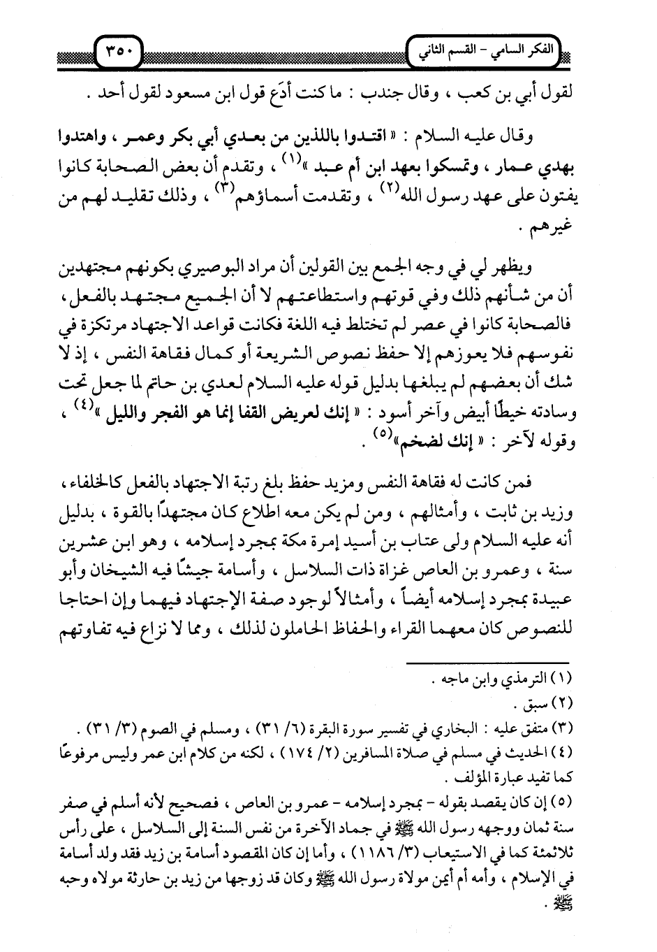 وقال عليه السلام: "اقتدوا باللذين من بعدي أبي بكر وعمر, واهتدوا بهدي عمار، وتمسكوا بعهد ابن أم عبد" 1، وتقدَّم أن بعض الصحابة كانوا يفتون على عهد رسول الله2، وتقدَّمت أسماؤهم3، وذلك تقليد لهم من غيرهم.
