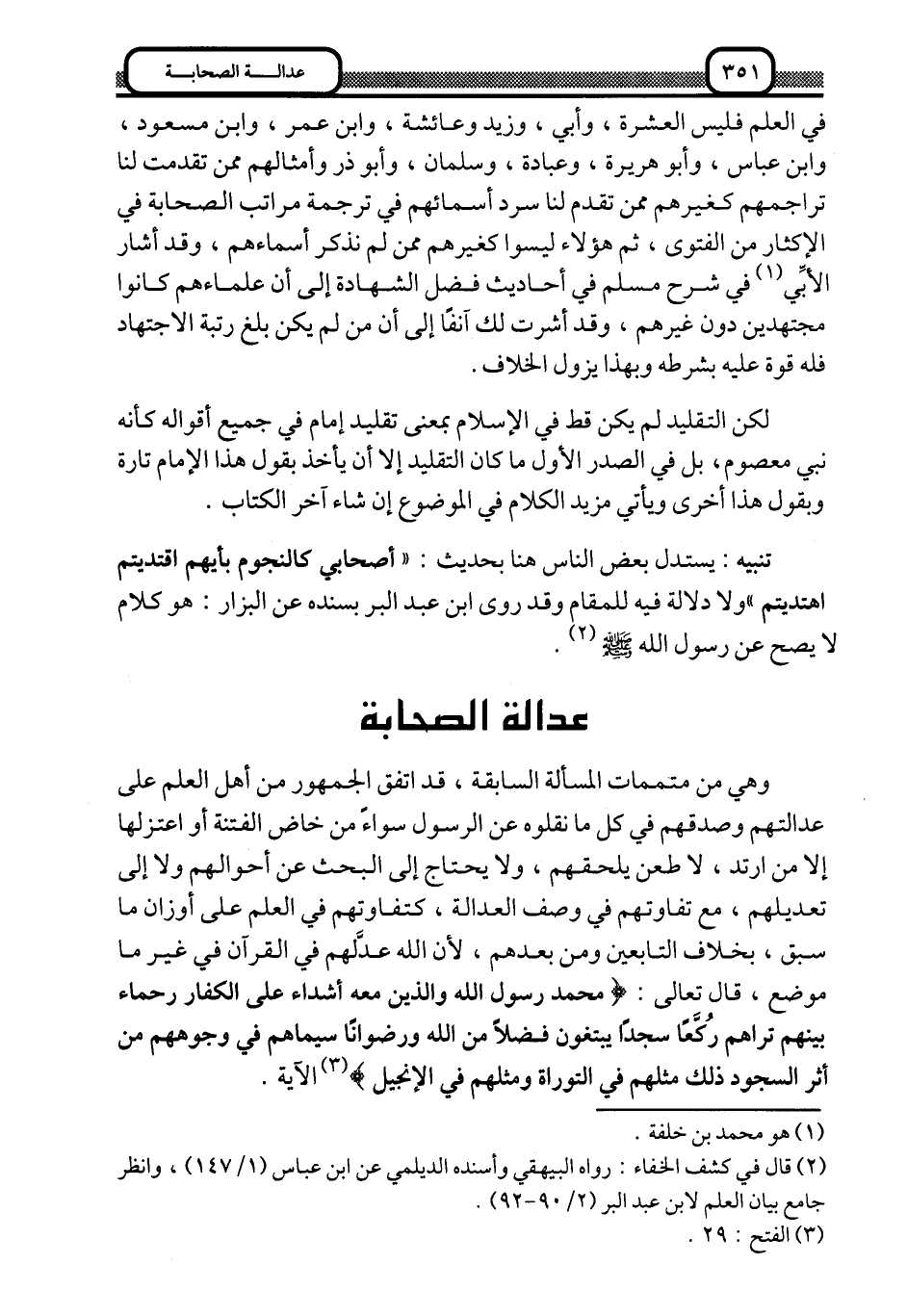 تنبيه: يستدل بعض الناس هنا بحديث: "أصحابي كالنجوم بأيهم اقتديتم اهتديتم" , ولا دلالة فيه للمقام, وقد روى ابن عبد البر بسنده عن البزار: هو كلام لا يصح عن رسول الله -صلى الله عليه وسلم2.