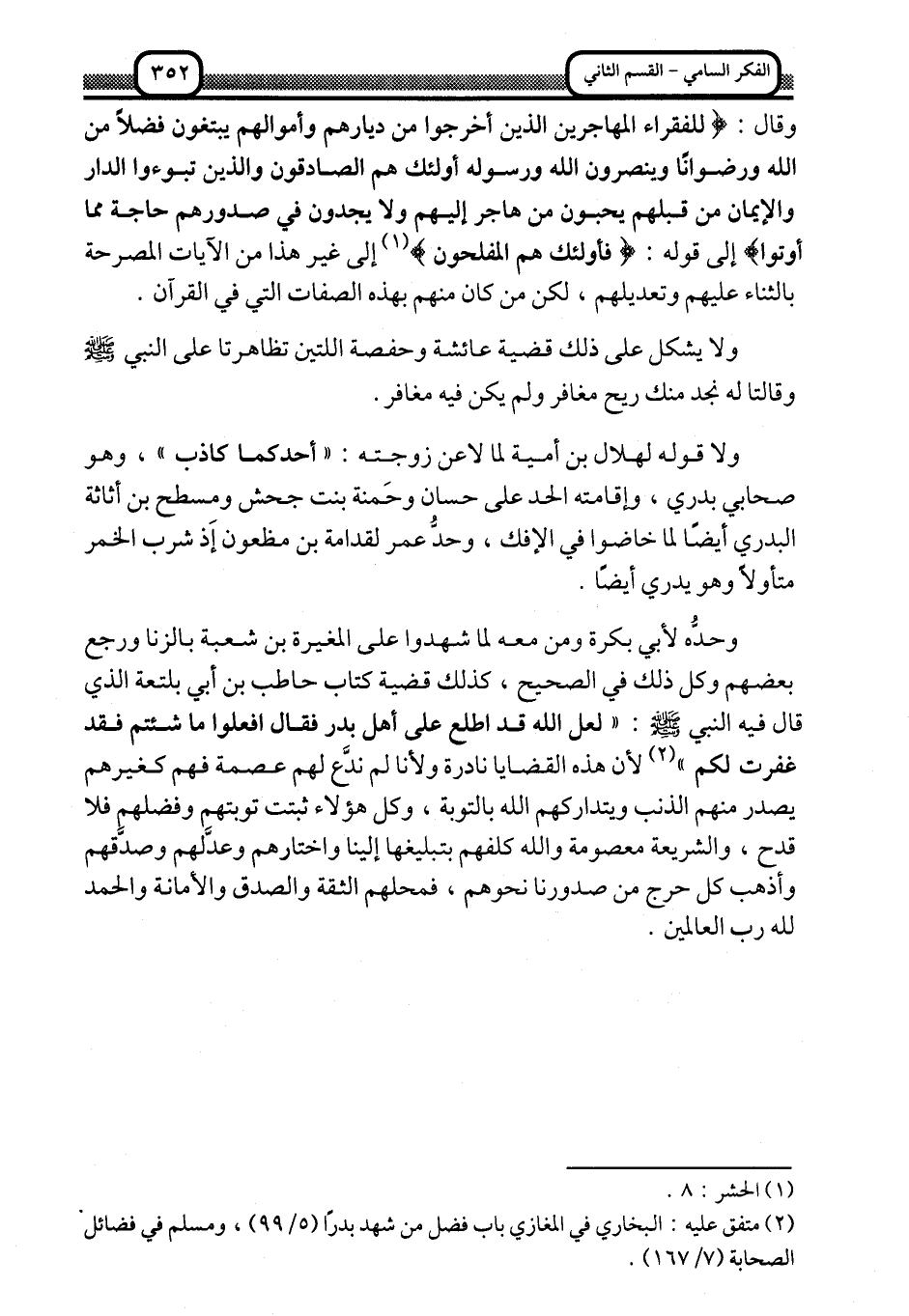 ولا قوله لهلال بن أمية لما لاعَنَ زوجته: "أحدكما كاذب"، وهو صحابي بدري، وإقامته الحد على حسان وحمنة بنت جحش ومسطح بن أثاثة البدري أيضًا لما خاضوا في الإفك، وحدُّ عمر لقدامة بن مظعون إذ شرب الخمر متأولًا وهو يدري أيضًا.