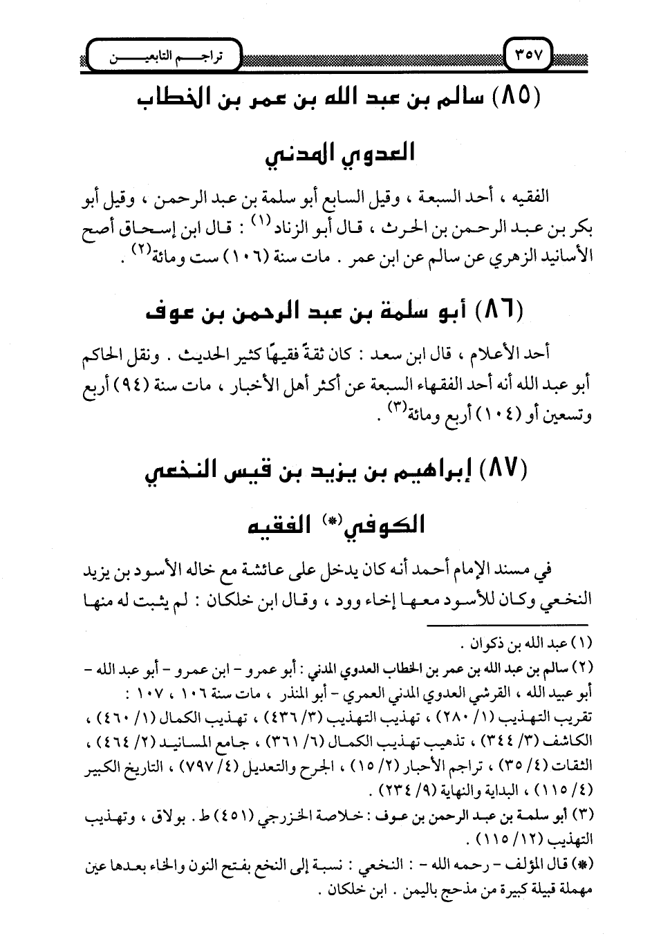 2 سالم بن عبد الله بن عمر بن الخطاب العدوي المدني: أبو عمرو - ابن عمرو - أو عبد الله، أبو عبد لله، القرشي العدوي المدني العمري، أبو المنذر، مات سنة 106، 107. تقريب التهذيب "1/ 280"، تهذيب التهذيب "3/ 436"، تهذيب الكمال "1/ 460"، الكاشف "3/ 344"، تهذيب تهذيب الكمال "6/ "، جامع المسانيد "2/ 464"، الثقات "4/ 35"، تراجم الأحبار "2/ 15"، الجرح والتعديل "4/ 797"، التاريخ الكبير "4/ 115"، البداية والنهاية "9/ 234".
