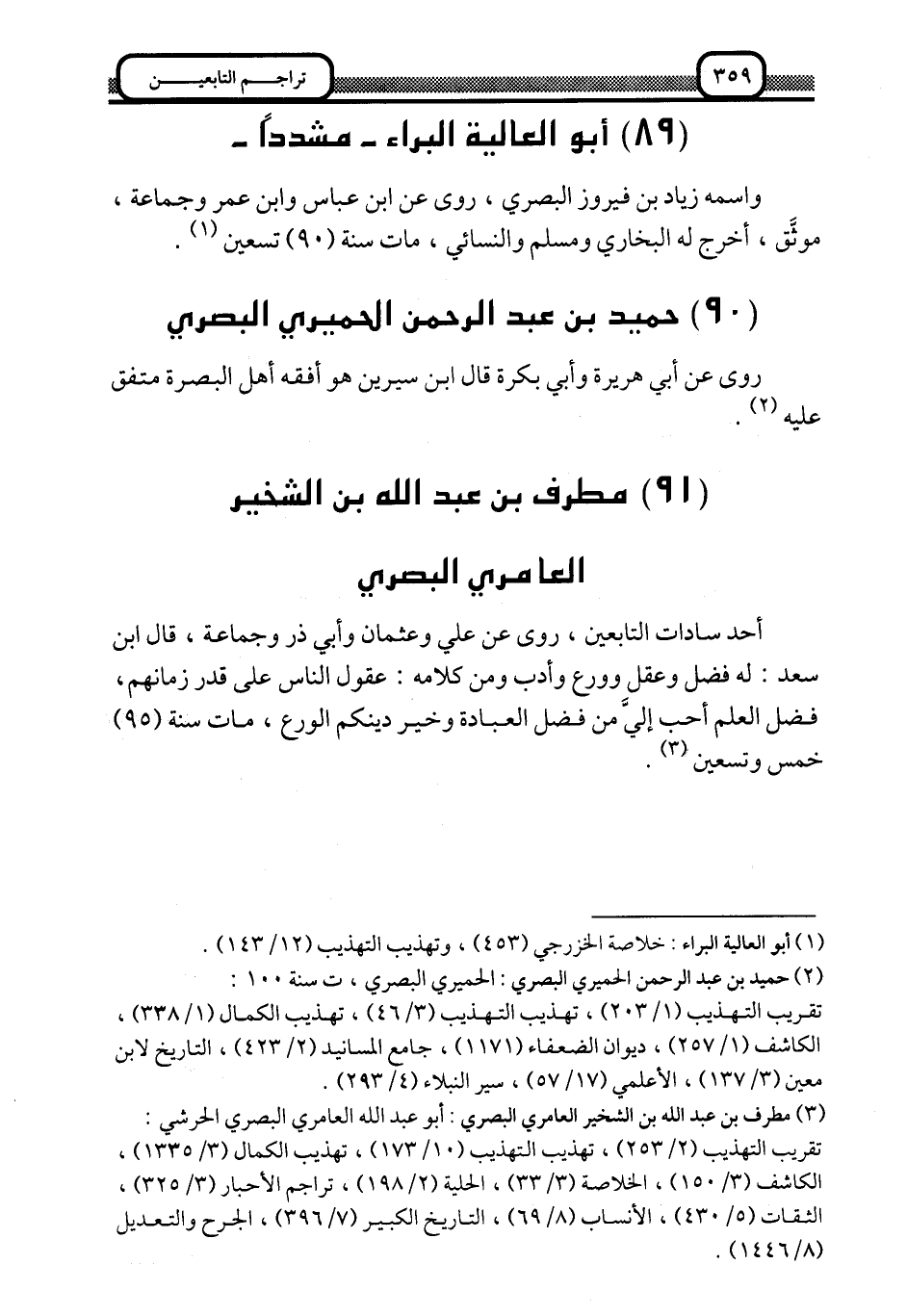 3 مطرف بن عبد الله بن الشخير العامري البصري: أبو عبد الله العامري البصري الحرشي. تقريب التهذيب "2/ 253"، تهذيب التهذيب "10/ 173"، تهذيب الكمال "3/ 1335"، الكاشف "3/ 150"، الخلاصة "3/ 33"، الحلية "2/ 198"، تراجم الأحبار "3/ 325"، الثقات "5/ 430"، الأنساب "8/ 69"، التاريخ الكبير "7/ 396"، الجرح والتعديل "8/ 1446".