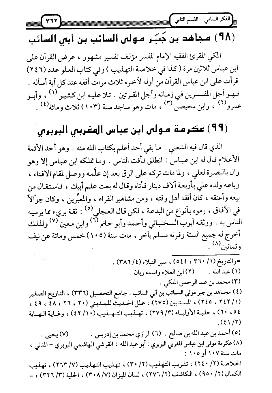 8 عكرمة مولى ابن عباس المغربي البربري: أبو عبد الله: القرشي الهاشمي البربري - المدني, مات سنة 107 أو 105. الخلاصة "2/ 240", تقريب التهذيب "2/ 30"، تهذيب التهذيب "7/ 263"، تهذيب الكمال "2/ 950"، الكاشف "2/ 276"، لسان الميزان "7/ 308"، الحلية "3/ 326"، سير النبلاء "5/ 12"، الضعفاء الكبير "3/ 373"، طبقات المفسرين "1/ 380"، وفيات الأعيان "1/ 319"، الكامل "5/ 1905"، وأصبهان "2/ 25"، جامع المسانيد "2/ 495".