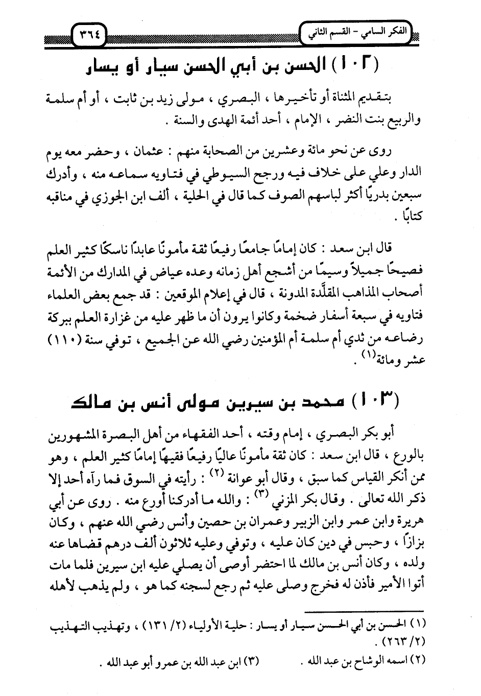 4 محمد بن سيرين مولى أنس بن مالك: أبو بكر الأنصاري البصري الأنسي مولى أنس بن مالك، مات سنة 110 أو بعدها: المعرفة والتاريخ "2/ 54"، والفهارس "751"، در السحابة "3/ 8"، المعين "327"، البداية والنهاية "9/ 267"، الوافي بالوفيات "3/ 146"، الكاشف "3/ 51", الخلاصة "2/ 412"، نسيم الرياض "2/ 408"، الطبقات الكبرى "9/ 174"، الثقات "5/ 349"، الأعلمى "26/ 283".