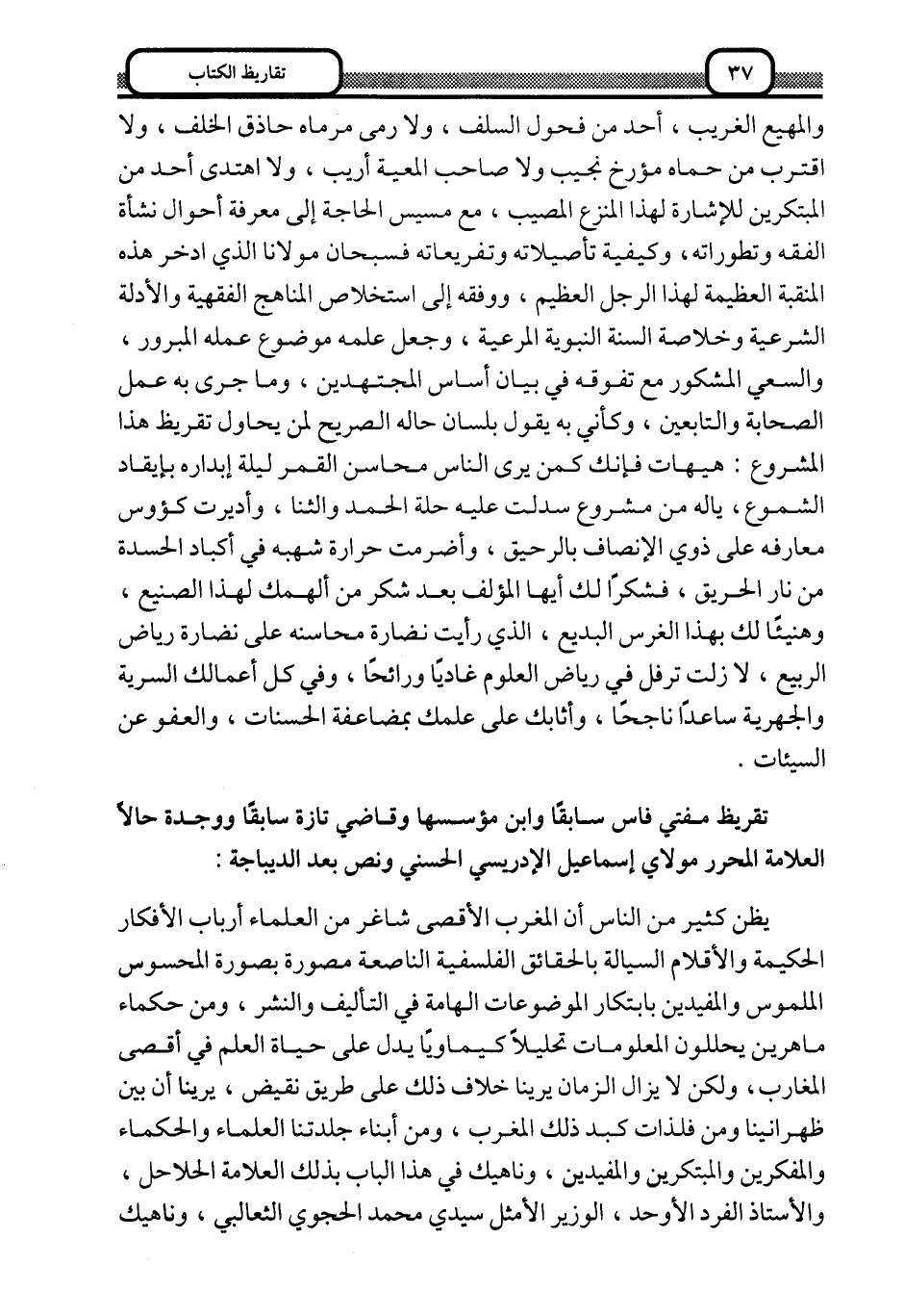 تقريظ مفتى فاس سابقًا, وابن مؤسسها وقاضي تازة سابقًا, ووجدة حالًا, العلامة المحرر مولاي إسماعيل الإدريسي الحسني, ونصَّ بعد الديباجة: