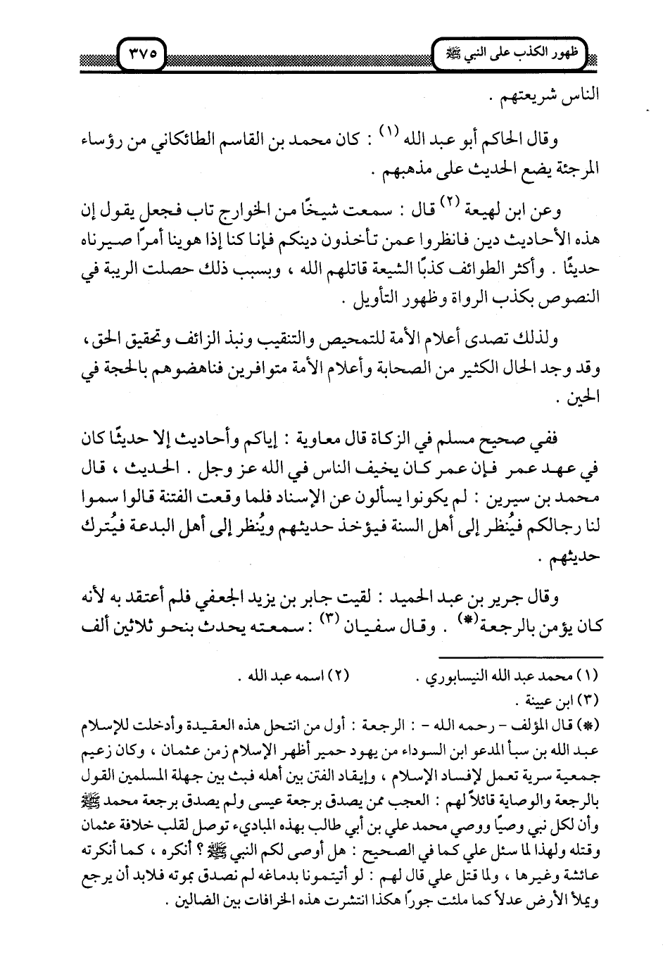 4 قال المؤلف -رحمه الله: الرجعة: أول من انتحل هذه العقيدة وأدخلت للإسلام عبد الله بن سبأ, المدعو ابن السوداء, من يهود حمير, أظهر الإسلام زمن عثمان، وكان زعيم جمعية سرية تعمل لإفساد الإسلام، وإيقاد الفتن بين أهله, فبثَّ بين جهلة المسلمين القول بالرجعة والوصاية قائلًا لهم: العجب ممن يصدق برجعة عيسى ولم يصدق برجعة محمد -صلى الله عليه وسلم, وأن لكل نبي وصيًّا, ووصي محمد علي بن أبي طالب. بهذه المبادئ توصَّل لقلب خلافة عثمان وقتله, ولهذا لما سُئِلَ علي كما في الصحيح: هل أوصى لكم النبي -صلى الله عليه وسلم؟ أنكره، كما أنكرته عائشة وغيرها، ولما قُتِلَ علي قال لهم: لو أتيمونا بدماغه لم نصدق بموته, فلا بُدَّ أن يرجع ويملأ الأرض عدلًا كما ملئت جورًا, هكذا انتشرت هذه الخرافات بين الضالين.