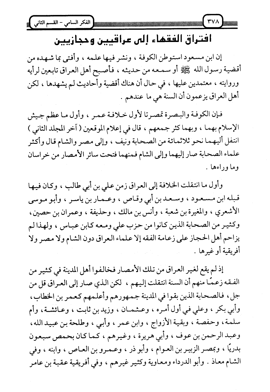 إذ لم يقع لغير العراق من تلك الأمصار, فخالفوا أهل المدينة في كثير من الفقه زعمًا منهم أن السنة انتقلت إليهم، لكن الذي صار إلى العراق قل من جل، فالصحابة الذين بقوا في المدينة جمهورهم وأعلمهم كعمر بن الخطاب، وأبي بكر، وعلي في أول أمره، وعثمان، وزيد بن ثابت، وعائشة، وأم سلمة، وحفصة، وبقية الأزواج، وابن عمر، وأُبَيّ، وطلحة بن عبيد الله، وعبد الرحمن بن عوف، وأبي هريرة، وغيرهم، كما كان بحمص سبعون بدريًّا، وبمصر الزبير بن العوام، وأبو ذر، وعمرو بن العاص، وابنه، وفي الشام معاذ, وأبو الدرداء ومعاوية وكثير غيرهم، وفي أفريقية عقبة بن عامر