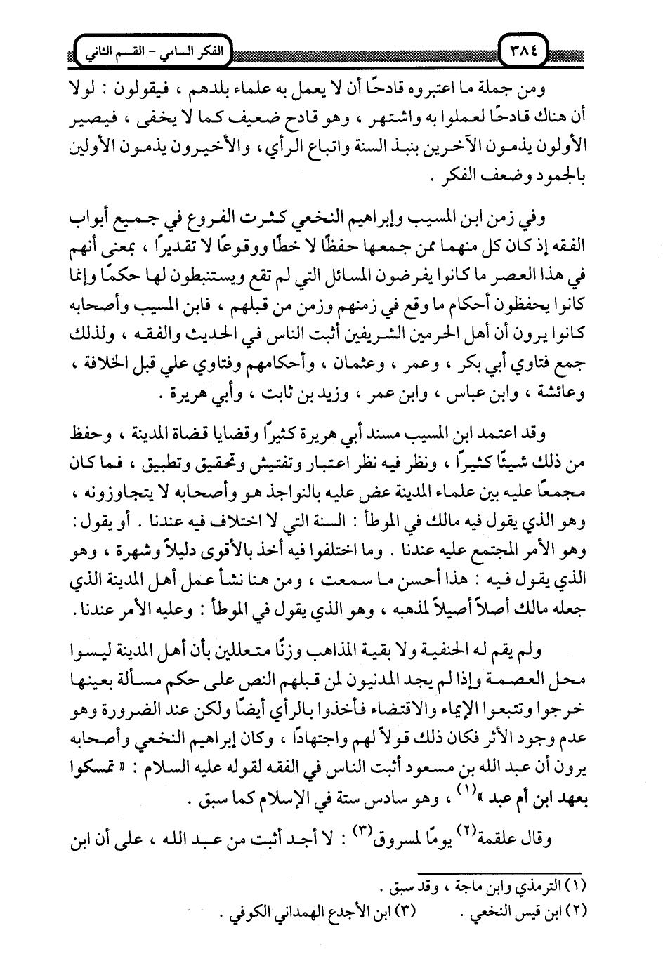 ولم يقل له الحنفية ولا بقية المذاهب وزنًا, متعللين بأن أهل المدينة ليسوا محل العصمة, وإذا لم يجد المدنيون لمن قبلهم النص على حكم مسألة بعينها, خرجوا وتتبعوا الإيماء والاقتضاء, فأخذوا بالرأي أيضًا, ولكن عند الضرورة وهو عدم وجود الأثر, فكان ذلك قولًا لهم واجتهادًا، وكان إبراهيم النخعي وأصحابه يرون أن عبد الله بن مسعود أثبت الناس في الفقه لقوله -عليه السلام: "تمسكوا بعهد ابن أم عبد" 1، وهو سادس ستة في الإسلام كما سبق.
