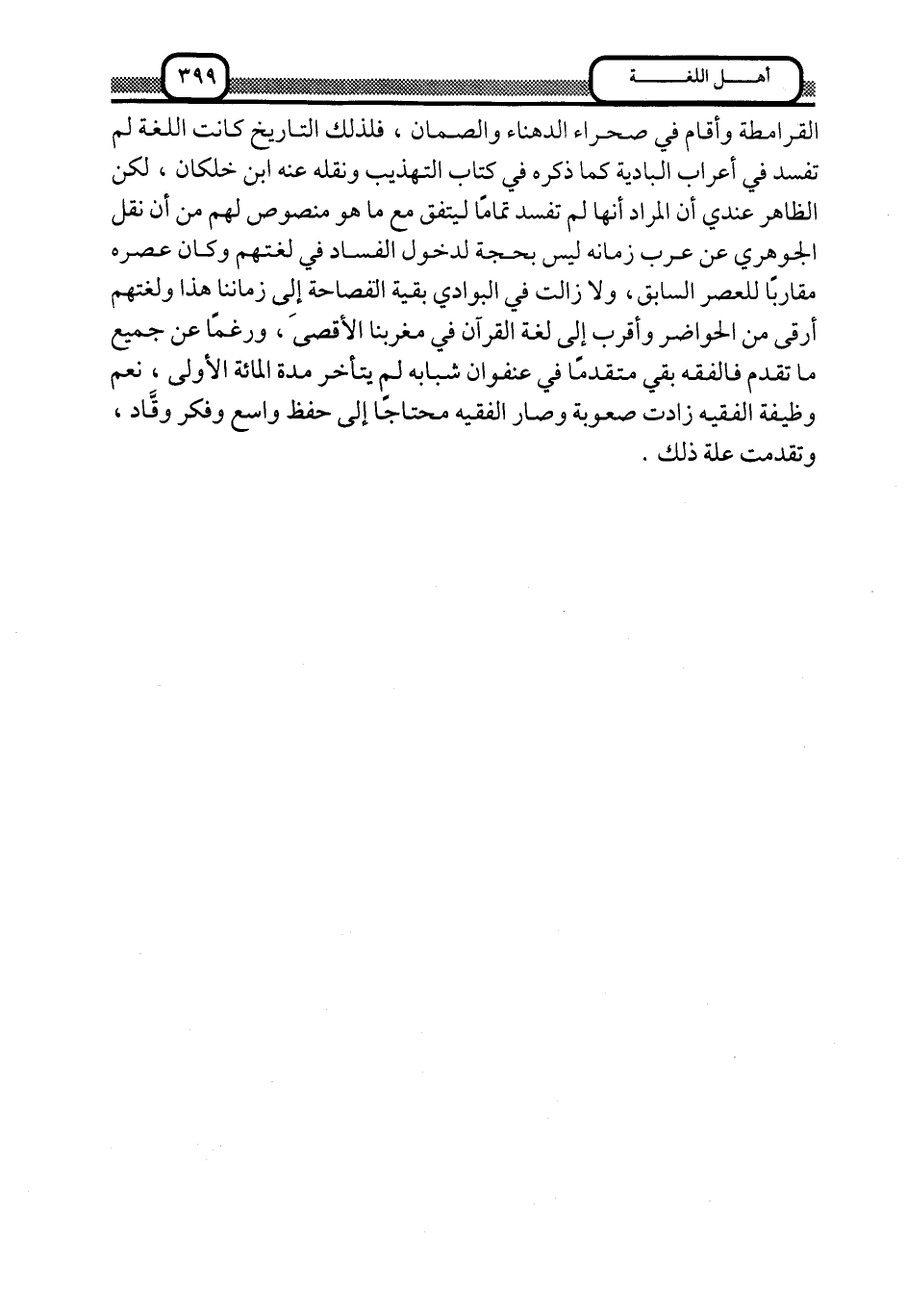 الذي توفي سنة "370" سبعين وثلاثمائة1، إنما مهر في اللغة لما أسرته القرامطة, وأقام في صحراء الدهناء والصمان، فلذلك التاريخ كانت اللغة لم تفسد في أعراب البادية كما ذكره في كتاب التهذيب ونقله عنه ابن خلكان، لكن الظاهر عندي أن المراد أنها لم تفسد تمامًا, لينفق مع ما هو منصوص لهم من أن نقل الجوهري عن عرب زمانه ليس بحجة لدخول الفساد في لغتهم, وكان عصره مقاربًا للعصر السابق، ولا زالت في البوادي بقية الفصاحة إلى زماننا هذا, ولغتهم أرقى من الحواضر وأقرب إلى لغة القرآن في مغربنا الأقصى، ورغمًا عن جميع ما تقدَّم, فالفقه بقي متقدمًا في عنفوان شبابه لم يتأخر مدة المائة الأولى، نعم وظيفة الفقيه زادت صعوبة, وصار الفقيه محتاجًا إلى حفظ واسع وفكر وقّاد، وتقدَّمت علة ذلك.