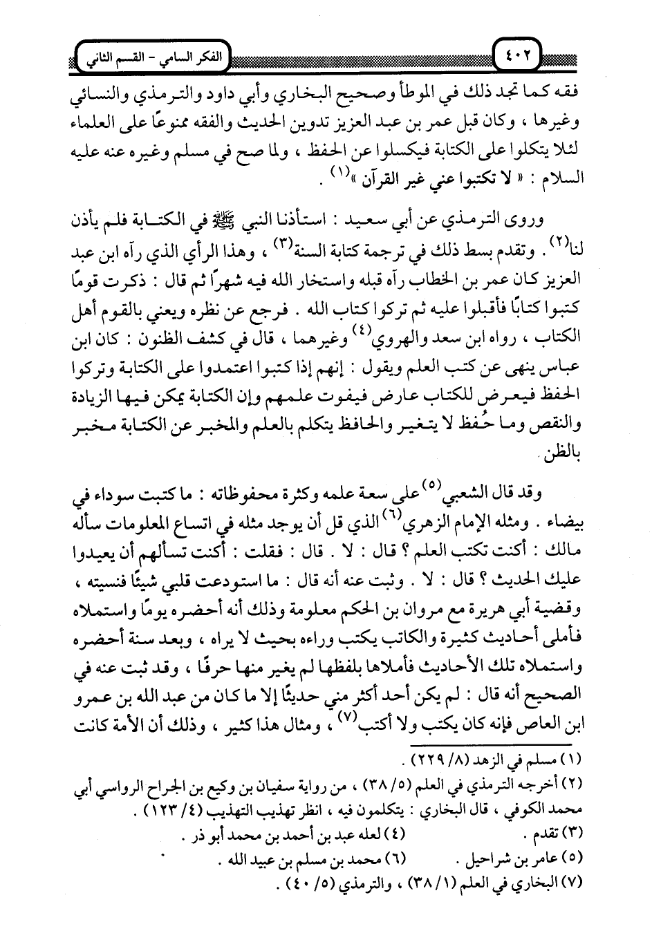 فقه, كما تجد ذلك في الموطأ وصحيح البخاري وأبي داود والترمذي والنسائي وغيرها، وكان قبل عمر بن عبد العزيز تدوين الحديث والفقه ممنوعًا على العلماء لئلّا يتَّكِلُوا على الكتابة فيكسلوا عن الحفظ، ولما صحَّ في مسلم وغيره عنه -عليه السلام: "لا تكتبوا عني غير القرآن" 1.