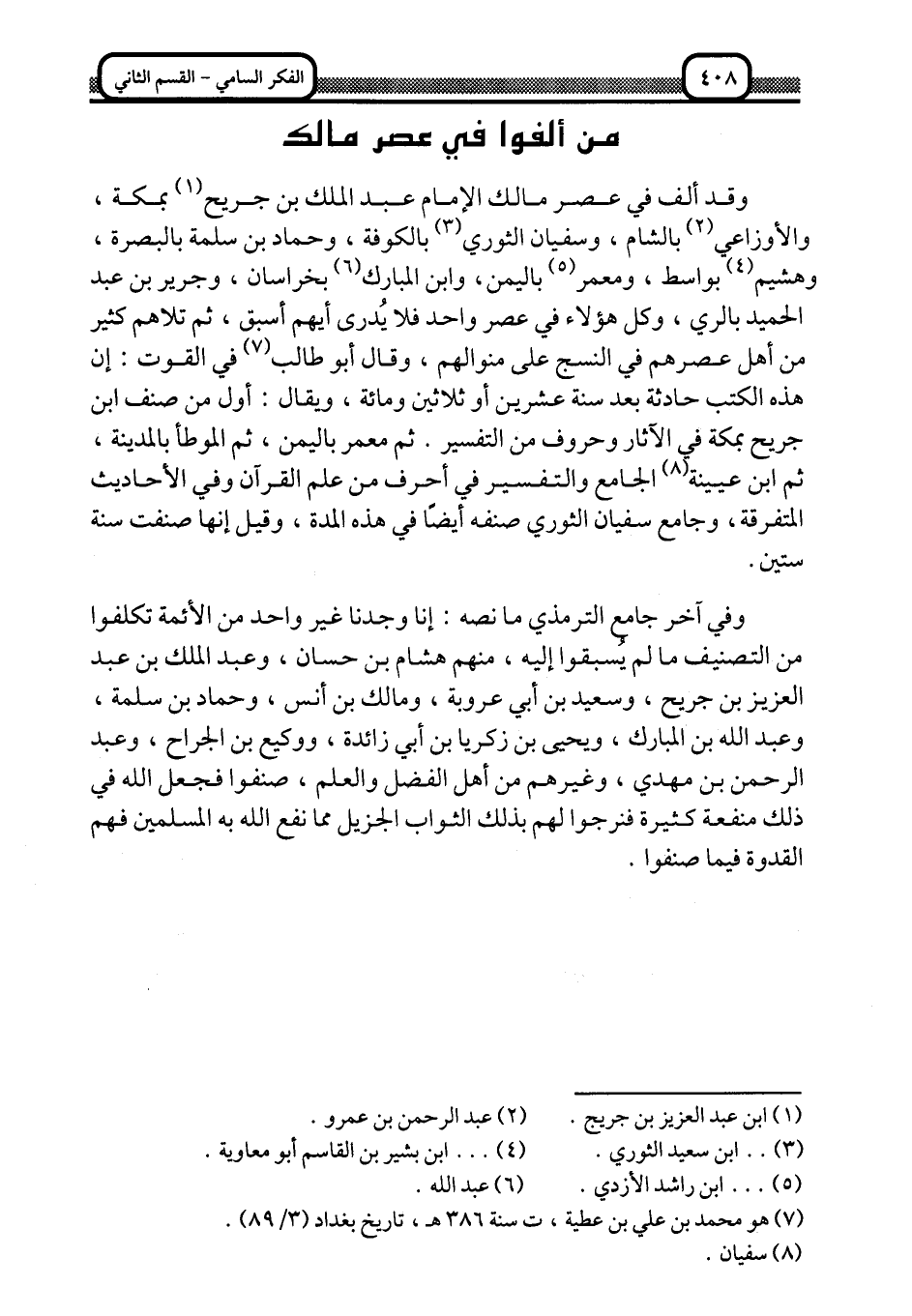 وقد ألف في عصر مالك الإمام عبد الملك بن جريح1 بمكة، والأوزاعي2 بالشام، وسفيان الثوري3 بالكوفة، وحمّاد بن سلمة بالبصرة, وهشيم4 بواسط، ومعمر5 باليمن، وابن المبارك6 بخراسان، وجرير بن عبد الحميد بالريّ، وكل هؤلاء في عصر واحد, فلا يُدرى أيهم أسبق، ثم تلاهم كثير من أهل عصرهم في النسج على منوالهم، وقال أبو طالب7 في القوت: إن هذه الكتب حادثة بعد سنة عشرين أو ثلاثين ومائة، ويقال: أول من صنَّف ابن جريح بمكة في الآثار وحروف من التفسير, ثم معمر باليمن، ثم الموطأ بالمدينة، ثم ابن عيينة8 الجامع والتفسير في أحرف من علم القرآن, وفي الأحاديث المتفرقة، وجامع سفيان الثوري صنَّفه أيضًا في هذه المدة، وقيل: إنها صنفت سنة ستين.