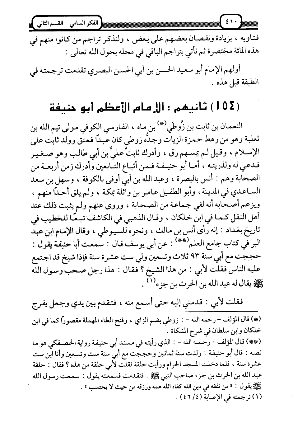 2 قال المؤلف -رحمه الله: الذي رأيته في مسند أبي حنيفة رواية الحصفكي هو ما نصه: قال أبو حنيفة: ولدت سنة ثمانين, وحججت مع أبي سنة ست وتسعين وأنا ابن ست عشرة سنة، فلما دخلت المسجد الحرام، ورأيت حلقة, فقلت لأبي حلقة من هذه؟ فقال: حلقة عبد الله بن الحرث بن جزء, صاحب النبي -صلى الله عليه وسلم, فتقدَّمت فسمعته يقول: سمعت رسول الله -صلى الله عليه وسلم- يقول: $"من تفقه في دين الله كفاه الله همَّه, ورزقه من حيث لا يحتسب".