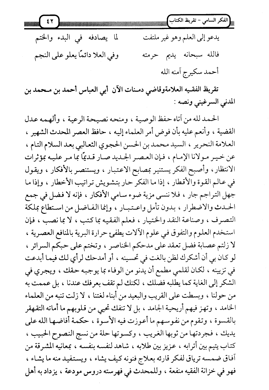 الحمد لله مَنْ آتاه حِفْظَ الوصية، ومنحه نصيحة الرعية، وألهمه عدل القضية، وأنعم عليه بأن فوّض أمر العلماء إليه، حافظ الصعر المحدث الشهير، العلامة النحرير، السيد محمد بن الحسن الحجوي الثعالبي, بعد السلام التام، عن خير مولانا الإمام، فإن العصر الجديد صار قديمًا بما مر عليه بمؤثرات الانتظار، وأصبح الفكر يستنير بمصابح الاعتبار، ويستنصر بالأفكار، ويقول في عالم القوة والأقطار، إذا ما الفكر حار بتشويش تراتيب الأخطار، وإذا ما جهل التراجم جار, فلا ننسى مزية ضوء سامي الأفكار, فإنه لا فضل في جمع الحدث والاضطرار، بدون تأمل واعتبار، وإنما الفاضل من استطاع بملكة التصرف، وصناعة النقد والاختيار، فعلم الفقيه بما كتب، لا بما نصب، فإن استخدم العلوم والتفوق في علوم الآلات يطفئ حرارة البرية بالمنافع العصرية، لازلتم عصابة فضل تعقد على مدحكم الخناصر، وتختم على حبكم السرائر، لو كان بي أن أشكرك لظنَّ في تحسينه، أو أمدحك لرأي لك فيما أبدعت في تزيينه، لكان لقلمي مطمع أن يدنو من الوفاء بما يوجبه حقك، ويجري في الشكر إلى الغاية كما يطلبه فضلك، لكنك لم تقف بعرفك عندنا، بل عممت به من حولنا، وبسطت على القريب والبعيد من أبناء لغتنا، لازلت تنبه من العلماء الخامد، وتهز فيهم أريحية الجامد، بل لا تنفك تحيى من قلوبهم ما أماته التقهقر بالقسوة، وتقوم من نفوسهم ما أعوزت فيه الأسوة، حكمة أفاضها الله على يديك، فجردتها من ثوبها الغريب، وكسوتها حلة من نسج النصوح الحبيب، كتاب يتيم بين أترابه، عزيز بين طلابه، شاهد لنفسه بنفسه، بمعانيه المشرقة من آفاق ضمسه, تريق لفكر قارئه, بعلاج فنونه كيف يشاء، ويستفيد منه ما يشاء، فهو في خزانة الفقيه منفعة، وللمحدث في فهرسته دروس مودعة، يزداد به أهل