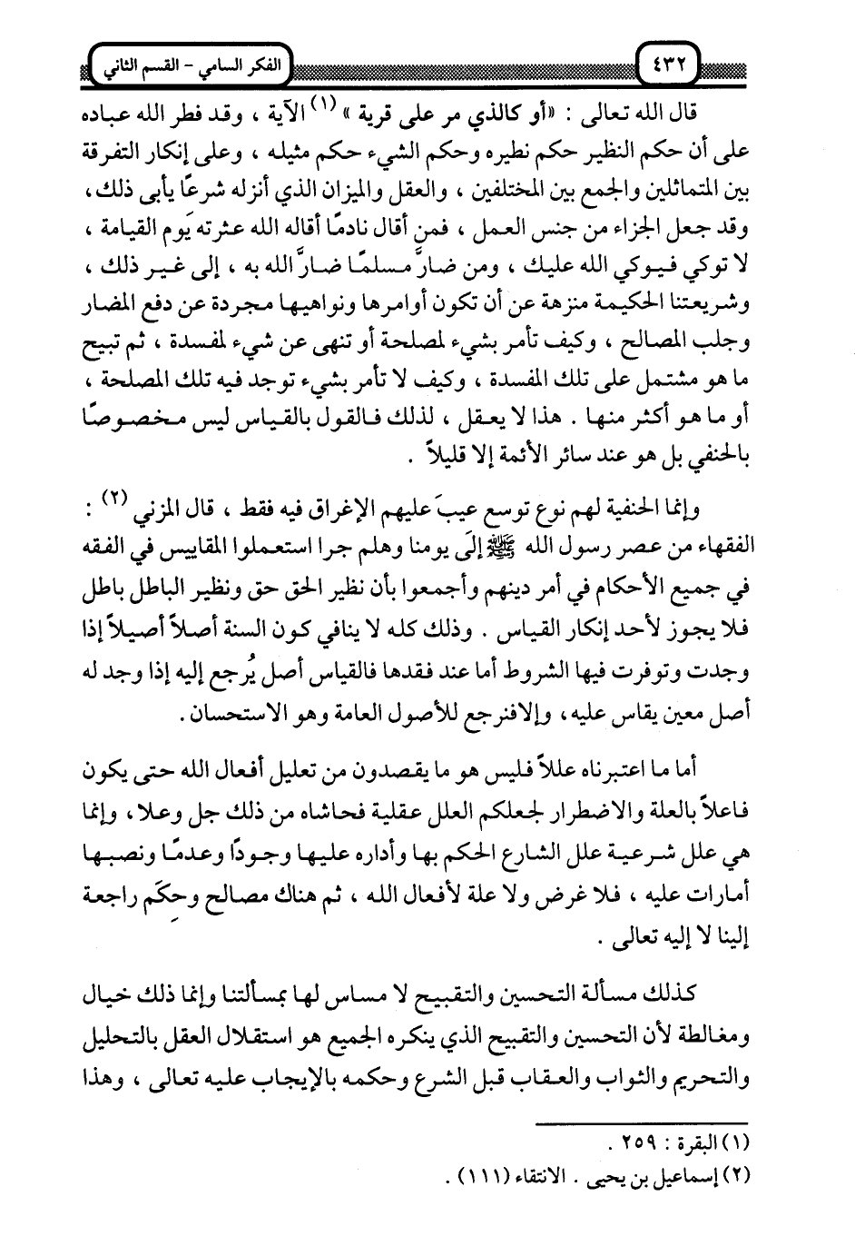 قال الله تعالى: {أَوْ كَالَّذِي مَرَّ عَلَى قَرْيَة} 1 الآية، وقد فطر الله عباده على أن حكم النظير حكم نظيره, وحكم الشيء حكم مثيله، وعلى إنكار التفرقة بين المتماثلين والجمع بين المختلفين، والعقل والميزان الذي أنزله شرعًا يأبى ذلك، وقد جعل الجزاء من جنس العمل، فمن أقال نادمًا أقال الله عثرته يوم القيامة، لا توكي فيوكي الله عليك، ومن ضارَّ مسلمًا ضارَّ الله به، إلى غير ذلك، وشريعتنا الحكمية منزَّهة عن أن تكون أوامرها ونواهيها مجرَّدة عن دفع المضارِّ وجلب المصالح، وكيف تأمر بشيء لمصلحة أو تنهى عن شيء لمفسدة، ثم تبيح ما هو مشتمل على تلك المفسدة، وكيف لا تأمر بشيء توجد فيه تلك المصلحة، أو ما هو أكثر منها. هذا لا يعقل، لذلك فالقول بالقياس ليس مخصوصًا بالحنفية, بل هو عند سائر الأئمة إلّا قليلًا.