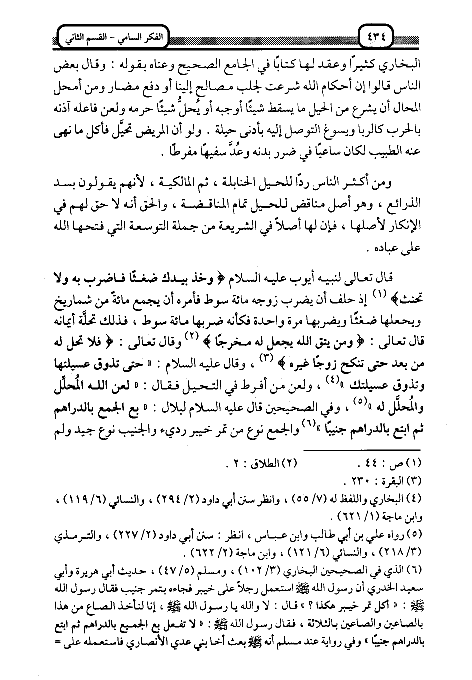 قال تعالى لنبيه أيوب -عليه السلام: {وَخُذْ بِيَدِكَ ضِغْثًا فَاضْرِبْ بِهِ وَلَا تَحْنَثْ} 1 إذ حلف أن يضرب زوجه مائة سوط, فأمره أن يجمع مائة من شماريخ ويجعلها ضغثًا, ويضربها مرة واحدة, فكأنه ضربها مائة سوط، فذلك تحلة أيمانه, قال تعالى: {وَمَنْ يَتَّقِ اللَّهَ يَجْعَلْ لَهُ مَخْرَجًا} 2، وقال تعالى: {فَلَا تَحِلُّ لَهُ مِنْ بَعْدُ حَتَّى تَنْكِحَ زَوْجًا غَيْرَهُ} 3، وقال -عليه السلام: "حتى تذوق عسيلتها وتذوق عسيلتك" 4، ولعن من أفرط في التحيل فقال: "لعن الله المحلِّلَ والمحلَّل له" 5، وفي الصحيحين قال -عليه السلام- لبلال: "بع الجمع بالدراهم, ثم ابتع بالدراهم جنيبًا" 6, والجمع نوع من تمر خيبر رديء, والجنيب نوع جيد, ولم