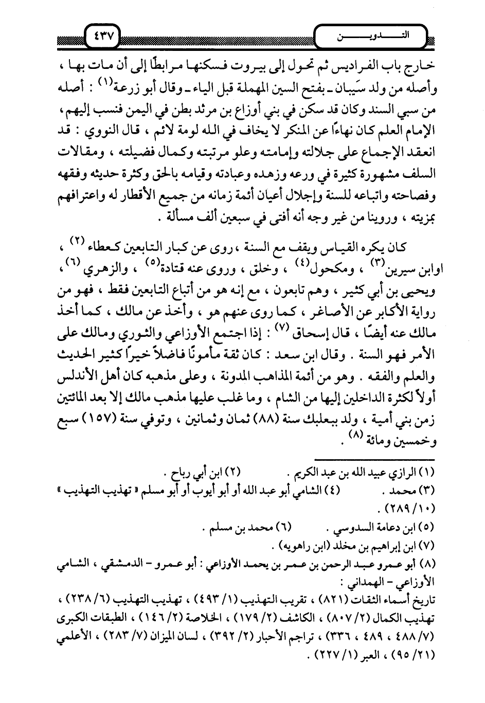 9 أبو عمرو عبد الرحمن بن عمر بن يحمد الأوزاعي: أبو عمرو -الدمشقي، الشامي الأوزاعي- الهمداني. تاريخ أسماء الثقات "821"، تقريب التهذيب "1/ 493"، تهذيب التهذيب "6/ 238"، تهذيب الكمال "2/ 807"، الكاشف "2/ 179"، الخلاصة "2/ 146"، الطبقات الكبرى "7/ 488، 489، 336"، تراجم الأحبار "2/ 392"، لسان الميزان "7/ 283"، الأعلمي "21/ 95"، العبر "1/ 227".