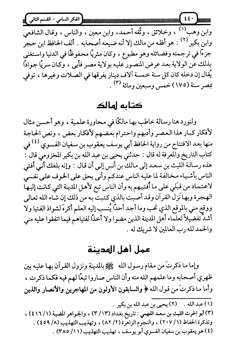 ولنورد هنا رسالة خاطب بها مالكًا في محاورة علمية، وهو أحسن مثال لأفكار كبار هذا العصر وأدبهم, واحترام بعضهم لأفكار بعض، ونص الحاجة منها بعد الافتتاح من رواية الحافظ أبي يوسف يعقوب بن سفيان الفسوي1 في كتاب التاريخ والمعرفة له قال: حدثني يحيى بن عبد الله بن بكير المخزومي قال: هذه رسالة الليث بن سعد إلى مالك بن أنس, إلى أن قال: وإنه بلغك أني أفتي الناس بأشياء مخالفة لما عليه الناس عندكم, وأنى يحق لى الخوف على نفسي لاعتماد مَنْ قبلي على ما أفتيهم به, وأن الناس تبع لأهل المدينة التي كانت إليها الهجرة, وبها نزل القرآن, وقد أصبت بالذي كتبت به من ذلك إن شاء الله تعالى, ووقع بالموقع الذي تحب, وما أجد أحدًا ينسب إليه العلم, أكره لشواذ الفتيا ولا أشد تفضيلًا لعلماء أهل المدينة الذين مضوا, ولا أخذًا لفتياهم فيما اتفقوا عليه مني, والحمد لله رب العالمين لا شريك له.