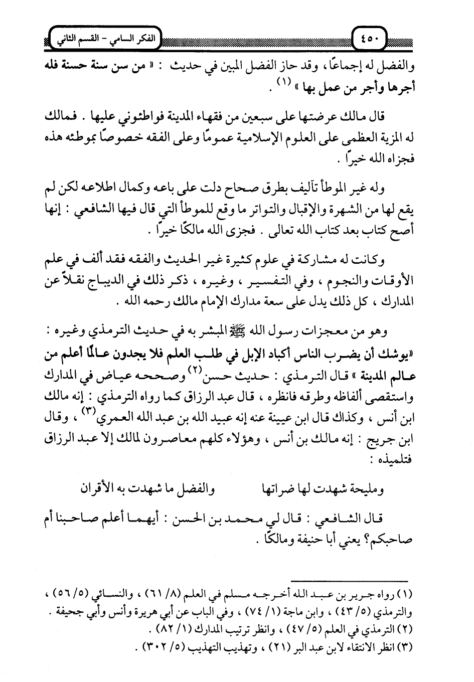 وهو من معجزات رسول الله -صلى الله عليه وسلم- المبشّر به في حديث الترمذي وغيره: "يوشك أن يضرب الناس أكباد الإبل في طلب العلم, فلا يجدون عالمًا أعلم من عالم المدينة" قال الترمذي: حديث حسن2, وصححه عياض في المدارك واستقصى ألفاظه وطرقه فانظره، قال عبد الرزاق كما رواه الترمذي: إنه مالك بن انس، وكذاك قال ابن عيينة عنه: إنه عبيد الله بن عبد الله العمري3، وقال ابن جريج: إنه مالك بن أنس، وهؤلاء كلهم معاصرون لمالك إلّا عبد الرزاق فتلميذه: