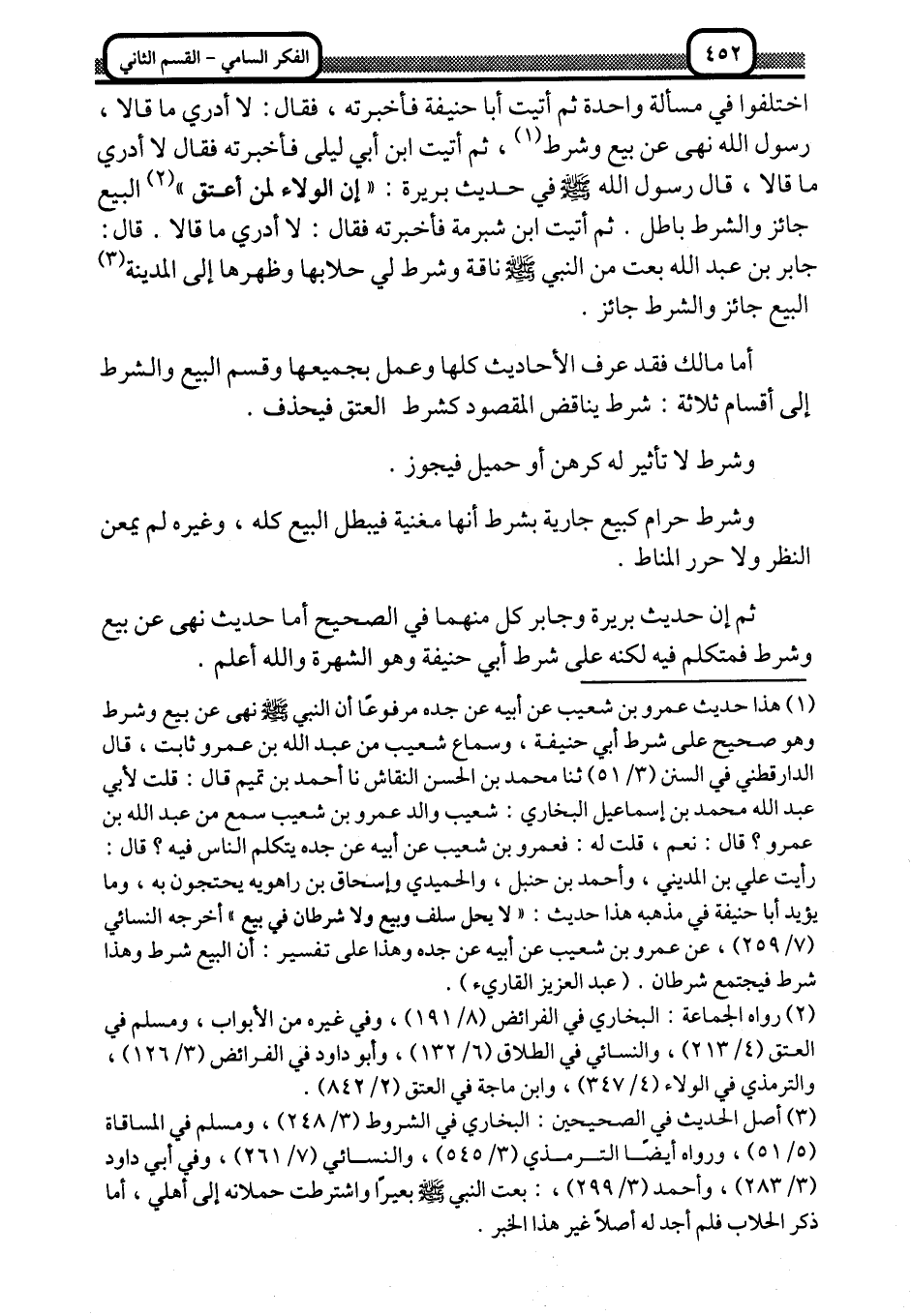 أما مالك فقد عرف الأحاديث كلها, وعمل بجميعها, وقسم البيع والشرط إلى أقسام: شرط يناقض المقصود كشرط العتق فيحذف.