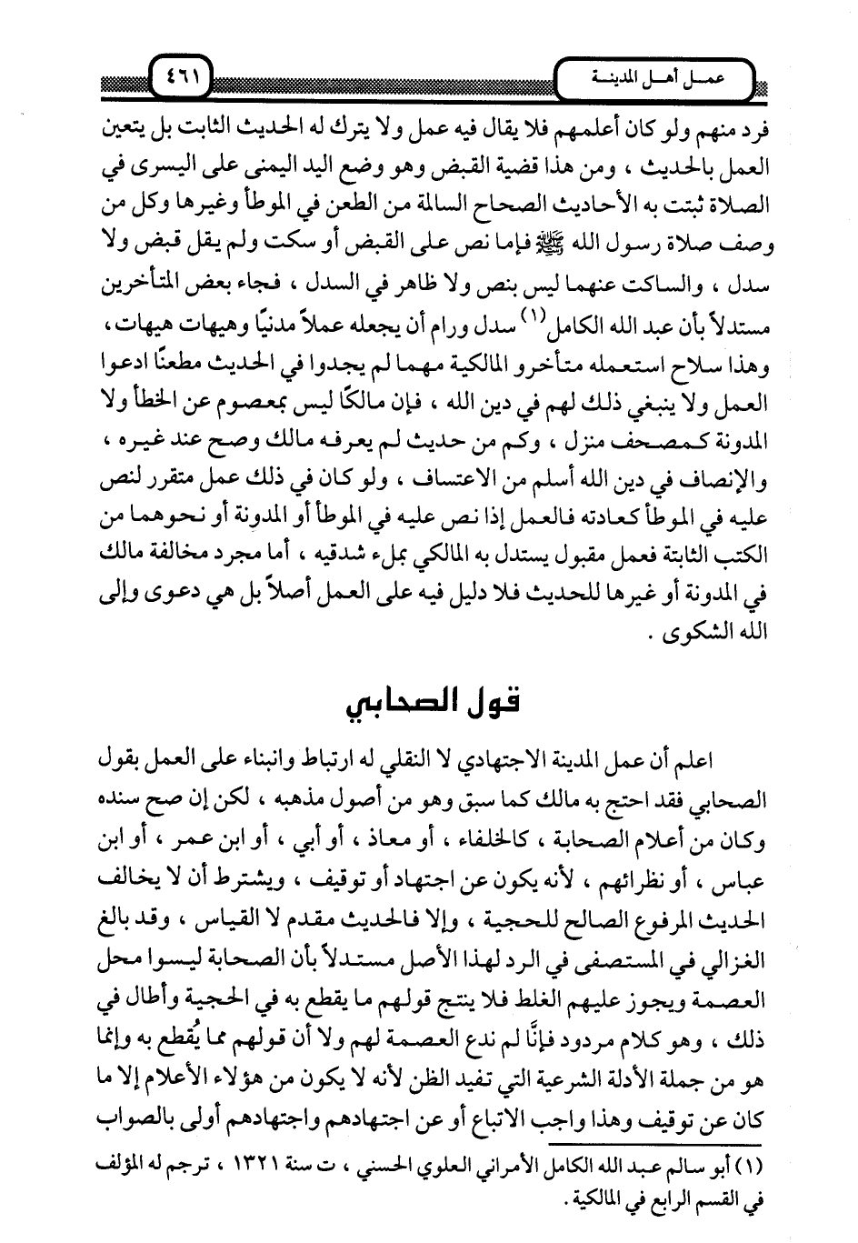فردَّ منهم ولو كان أعلمهم فلا يقال فيه عمل, ولا يترك له الحديث الثابت, بل يتعيّن العمل بالحديث، ومن هذا قضية القبض, وهو وضع اليد اليمنى على اليسرى في الصلاة, ثبتت به الأحاديث الصحاح السالمة من الطعن في الموطأ وغيرها, وكل من وصف صلاة رسول الله -صلى الله عليه وسلم, فإما نصَّ على القبض, أو سكت ولم يقل قبض ولا سدل، والساكت عنهما ليس بنص ولا ظاهر في السدل، فجاء بعض المتأخرين مستدلًا بأن عبد الله الكامل1 سدل ورام أن يجعله عملًا مدنيًّا وهيهات هيهات، وهذا سلاح استعمله متأخرو المالكية مهما لم يجدوا في الحديث مطعنًا, ادعوا العمل ولا ينبغي ذلك لهم في دين الله، فإن مالكًا ليس بمعصوم عن الخطأ ولا المدونة كمصحف منزل، وكم من حديث لم يعرف مالك وصح عند غيره، والإنصاف في دين الله أسلم من الاعتساف، ولو كان في ذلك عمل متقرر لنص عليه في الموطأ كعادته, فالعمل إذا نصَّ عليه في الموطأ أو المدونة أو نحوهما من الكتب الثابتة فعمل مقبول يستدل به المالكي بملء شدقيه، أما مجرد مخالفة مالك في المدونة أو غيرها للحديث فلا دليل فيه على العمل أصلًا, بل هي دعوى, وإلى الله الشكوى.