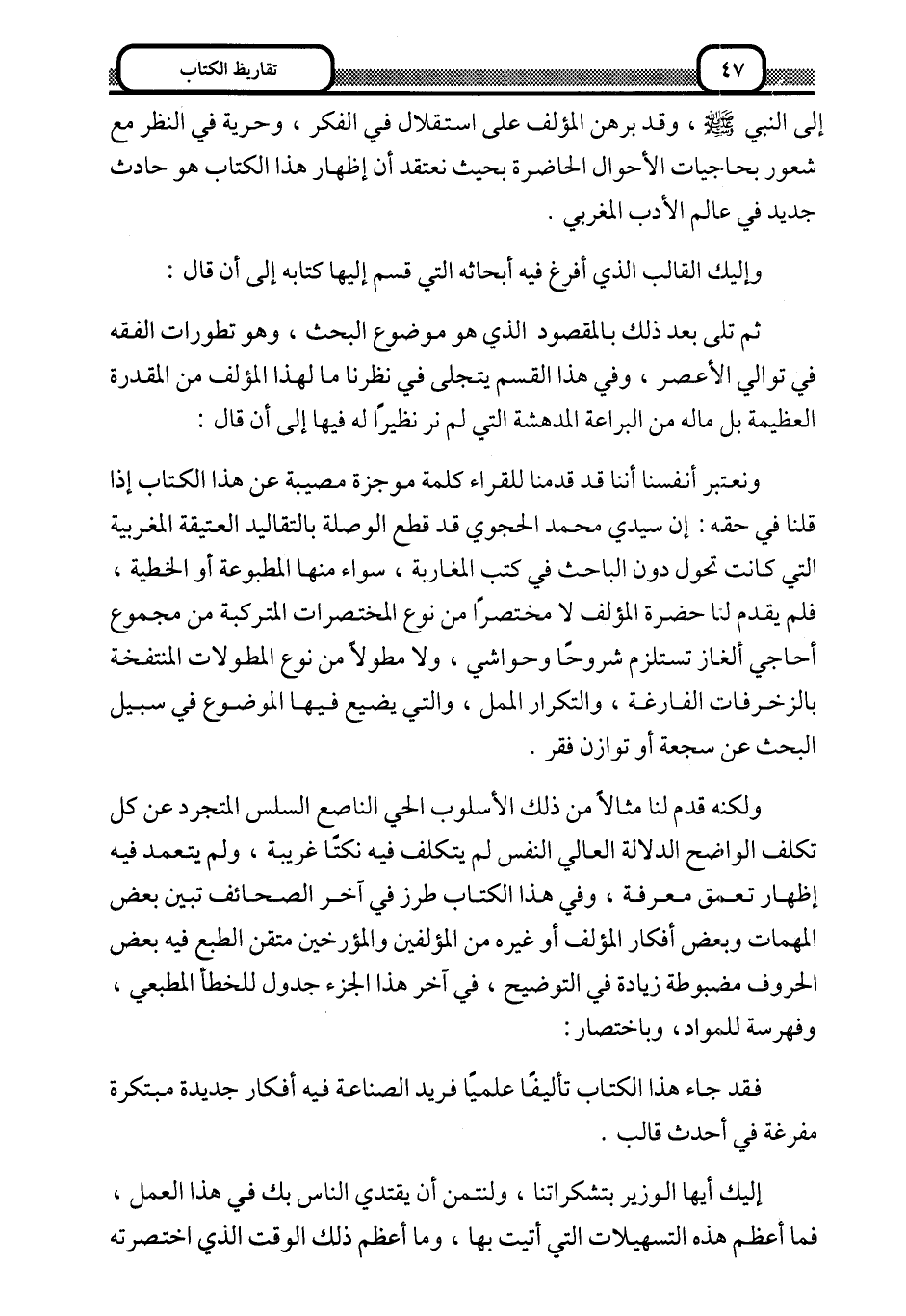 ونعتبر أنفسنا قد قدَّمنا للقراء كلمة موجزة مصيبة عن هذا الكتاب إذا قلنا في حقه: إن سيدي محمد الحجوي قد قطع الوصلة بالتقاليد العتيقة المغربية التي كانت تحول دون الباحث في كتب المغاربة، سواء منها المطبوعة أو الخطية، فلم يقدم لنا حضرة المؤلف لا مختصرًا من نوع المختصرات المتركبة من مجموع أحاجي ألغاز تستلزم شروحًا وحواشي، ولا مطولًا من نوع المطولات المنتفخة بالزخرفات الفارغة، والتكرار الممل، والتي يضيع فيها الموضوع في سبيل البحث عن سجعة أو توازن فقر.
