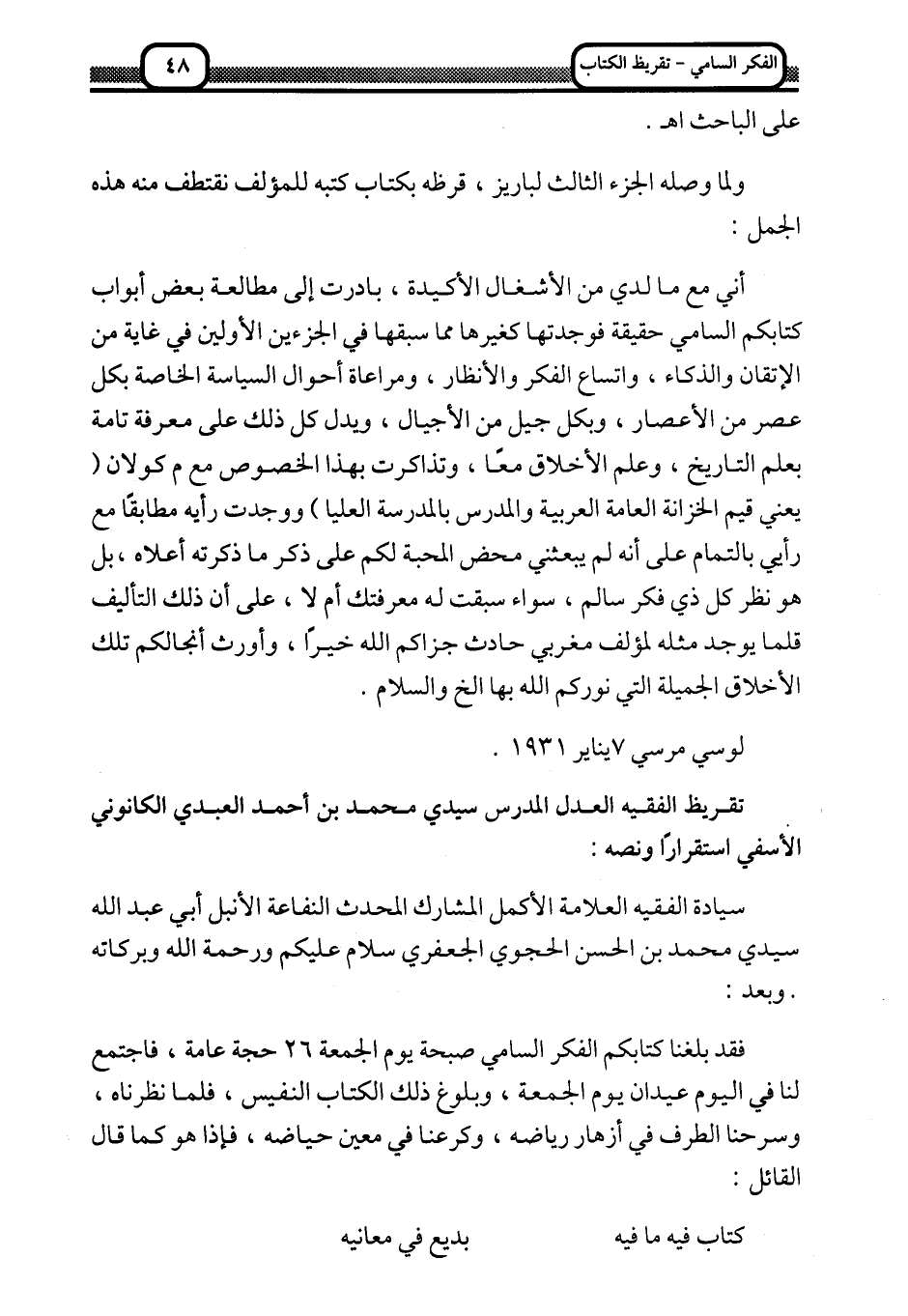 فقد بلغنا كتابكم الفكر السامي صبحة يوم الجمعة 26 حجة عامة، فاجتمع لنا في اليوم عيدان؛ يوم الجمعة، وبلوغ ذلك الكتاب النفيس، فلما نظرناه، وسرحنا الطرف في أزهار رياضه، وكرعنا في معين حياضه، فإذا هو كما قال القائل: