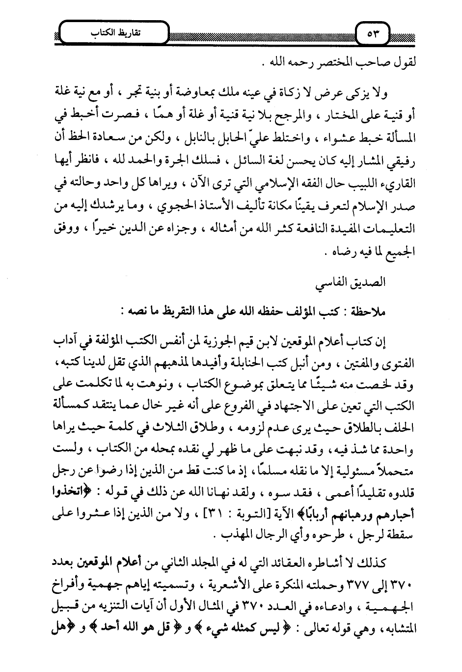 إن كتاب أعلام الموقعين لابن قيم الجوزية لمن أنفس الكتب المؤلفة في آداب الفتوى والمفتين، ومن أنبل كتب الحنابلة وأفيدها لمذهبهم الذي تقل لدينا كتبه، وقد لخصت منه شيئًا مما يتعلق بموضوع الكتاب، ونوَّهت به لما تكلمت على الكتب التي تعين على الاجتهاد في الفروع, على أنه غير خالٍ عمَّا ينتقد كمسألة الحلف بالطلاق, حيث يرى عدم لزومه، وطلاق الثلاث في كلمة حيث يراها واحدة, مما شذَّ فيه، وقد نبهت على ما ظهر لي نقده بمحله من الكتاب، ولست متحملًا مسئولية إلّا ما نقله مسلمًا، إذا ما كنت قط من الذين رضوا عن رجل قلدوه تقليدًا أعمى فقدسوه، ولقد نهانا الله عن ذلك في قوله: {اتَّخَذُوا أَحْبَارَهُمْ وَرُهْبَانَهُمْ أَرْبَابًا} الآية [التوبة: 31] ، ولا من الذين إذا عثروا على سقطة لرجل، طرحوه وأي الرجال المهذب.