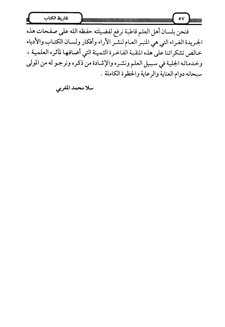 فنحن بلسان أهل العلم قاطبة نرفع لفضيلته حفظه الله على صفحات هذه الجريدة الغراء, التي هي المنبر العام لنشر الآراء وأفكار ولسان الكتاب والأدباء, خالص تشكراتنا على هذه المنقبة الفاخرة الثمينة التي أضافها لمآثره العلمية، وخدماته الجلية في سبيل العلم ونشره, والإشادة من ذكره, ونرجو له من المولى سبحانه دوام العناية والرعاية والحظوة الكاملة.