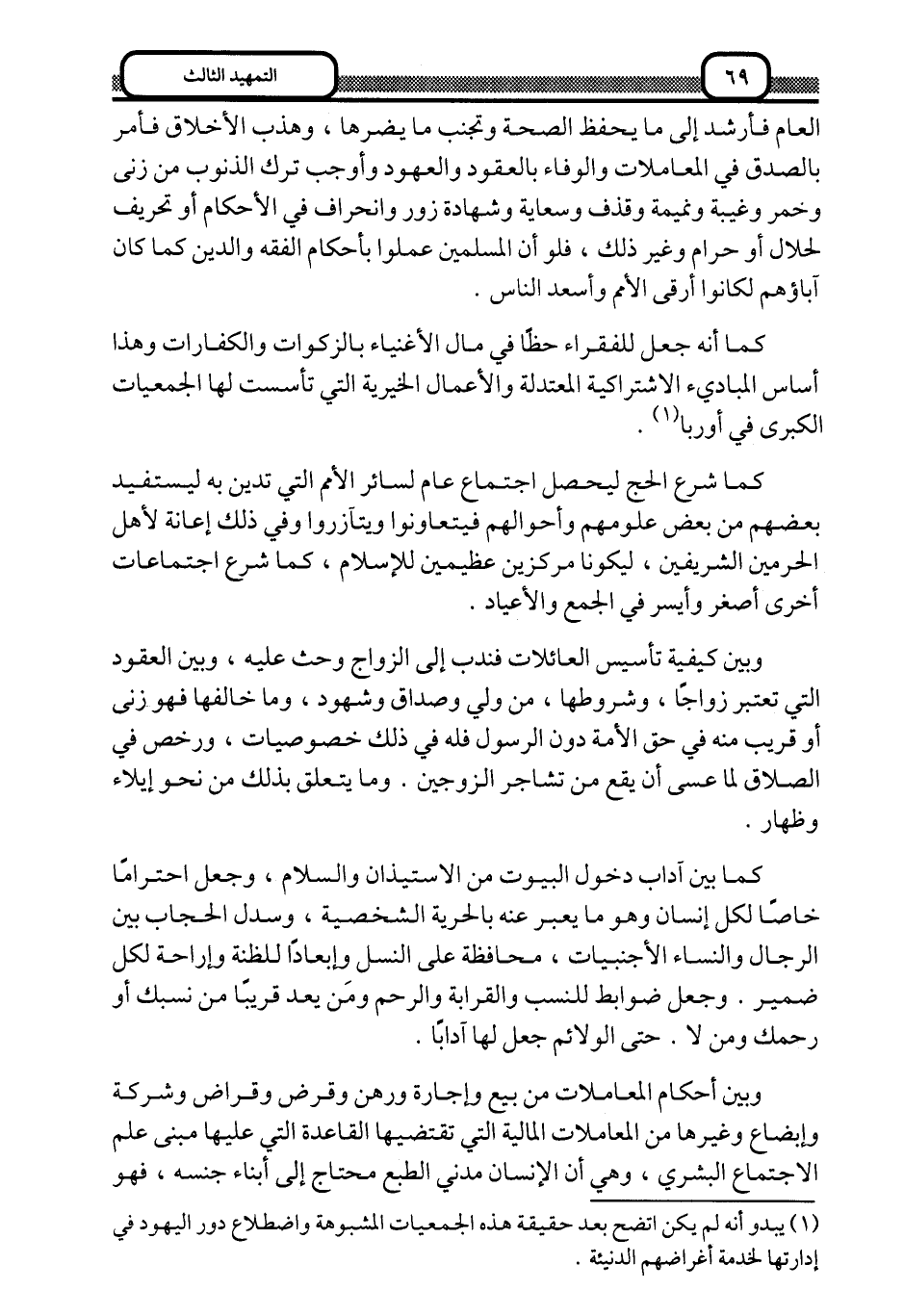 كما أنه جعل للفقراء حظًّا في مال الأغنياء بالزكوات والكفَّارات, وهذا أساس المبادئ الاشتراكية المعتدلة, والأعمال الخيرية التي تأسَّست لها الجمعيات الكبرى في أوربا1.