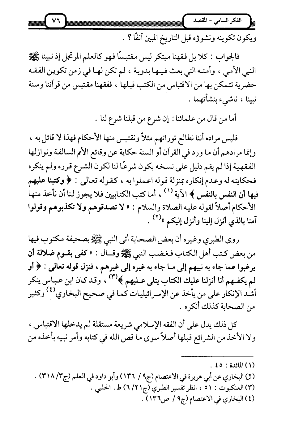 كل ذلك يدل على أن الفقه الإسلامي شريعة مستقلة لم يدخلها الاقتباس ولا الأخذ من الشرائع قبلها أصلًا, سوى ما قَصَّ الله في كتابه, وأمر نبيه بأخذه من