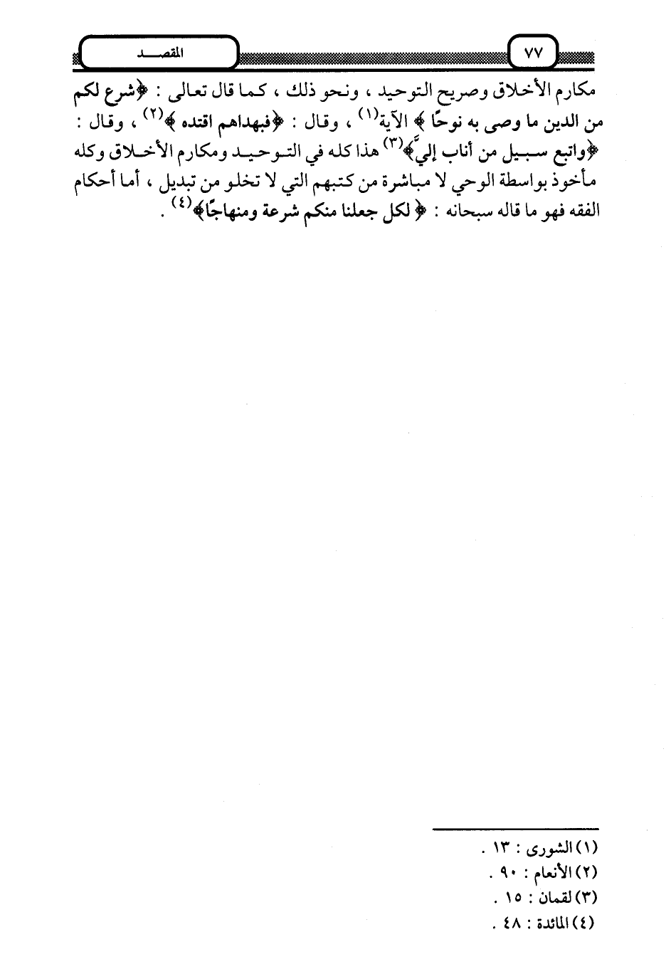 مكارم الأخلاق وصريح التوحيد، ونحو ذلك، كما قال تعالى: {شَرَعَ لَكُمْ مِنَ الدِّينِ مَا وَصَّى بِهِ نُوحًا} الآية1 وقال: {فَبِهُدَاهُمُ اقْتَدِهِ} 2، وقال: {وَاتَّبِعْ سَبِيلَ مَنْ أَنَابَ إِلَيَّ} 3 هذا كله في التوحيد ومكارم الأخلاق, وكله مأخوذ بواسطة الوحي لا مباشرة من كتبهم التي لا تخلو من تبديل، أما أحكام الفقه فهو ما قاله سبحانه: {لِكُلٍّ جَعَلْنَا مِنْكُمْ شِرْعَةً وَمِنْهَاجًا} 4.