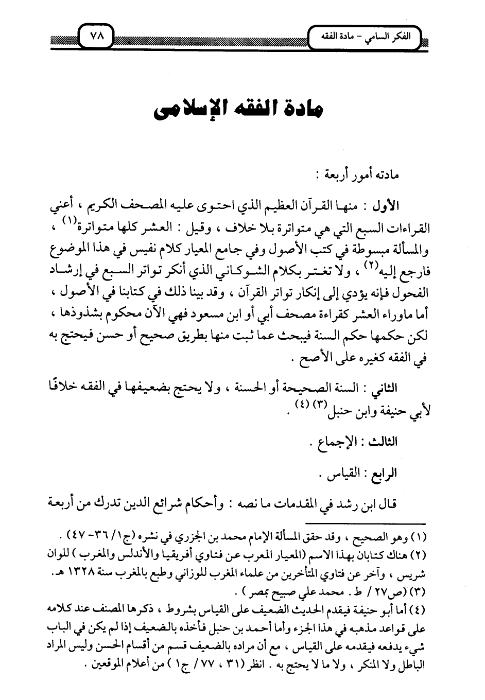 قال ابن رشد في المقدمات ما نصه: وأحكام شرائع الدين تدرك من أربعة