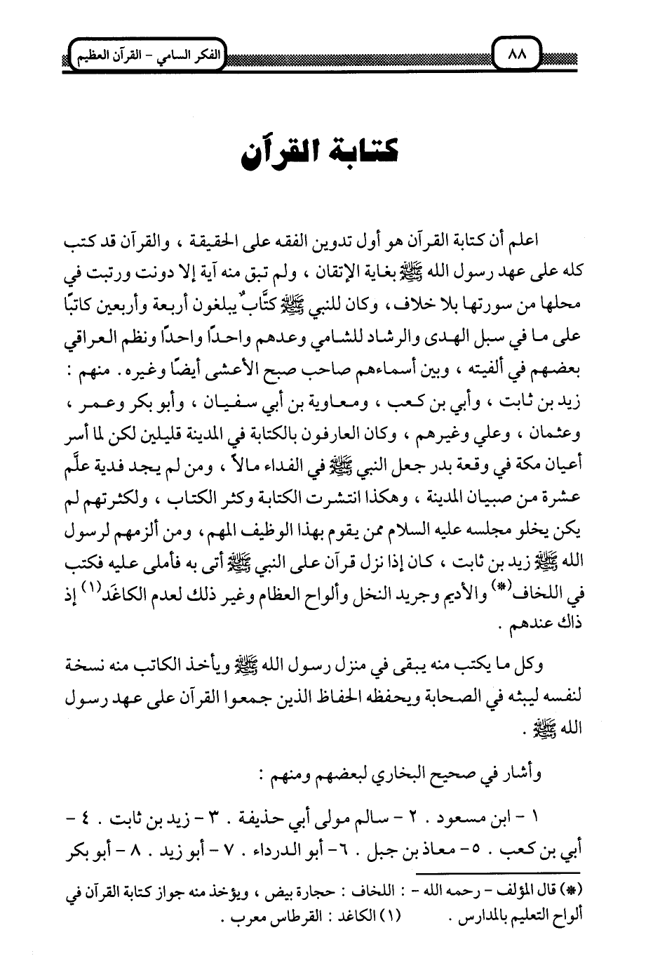 اعلم أن كتابة القرآن هو أول تدوين الفقه على الحقيقة، والقرآن قد كتب كله على عهد رسول الله -صلى الله عليه وسلم- بغاية الإتقان، ولم تبق منه آية إلّا دونت ورتبت في محله في سورتها بلا خلاف، وكان للنبي -صلى الله عليه وسلم- كُتَّابٌ يبلغون أربعة وأربعين كاتبًا على ما في سبل الهدى والرشاد للشامي, وعدهم واحدًا واحدًا, ونظم العراقي بعضهم في ألفيته، وبيَّنَ أسماءهم صاحب صبح الأعشى أيضًا وغيره. منهم: زيد بن ثابت، وأُبَيّ بن كعب، ومعاوية بن أبي سفيان، وأبو بكر وعمر، وعثمان، وعلي, وغيرهم، وكان العارفون بالكتابة في المدينة قليلين, لكن لما أُسِرَ أعيان مكة في وقعة بدر جعل النبي -صلى الله عليه وسلم- في الفداء مالًا، ومن لم يجد فدية علَّم عشرة من صبيان المدينة، وهكذا انتشرت الكتابة وكثر الكُتَّاب، ولكثرتهم لم يكن يخلو مجلسه -عليه السلام- ممن يقوم بهذا الوظيف المهم، ومن ألزمهم لرسول الله -صلى الله عليه وسلم- زيد بن ثابت، كان إذا نزل قرآن على النبي -صلى الله عليه وسلم- أتى به فأملى عليه, فكتب في اللخاف1 والأديم وجريد النخل وألواح العظام وغير ذلك, لعدم الكاغد2 إذ ذاك عندهم.