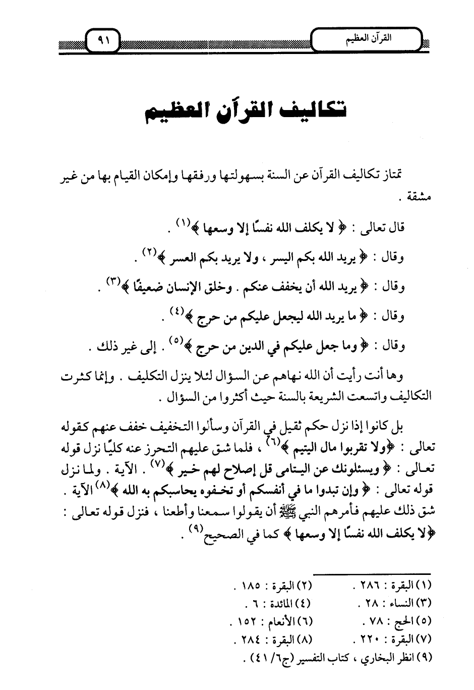 تمتاز تكاليف القرآن عن السنة بسهولتها ورفقها وإمكام القيام بها من غير مشقة.