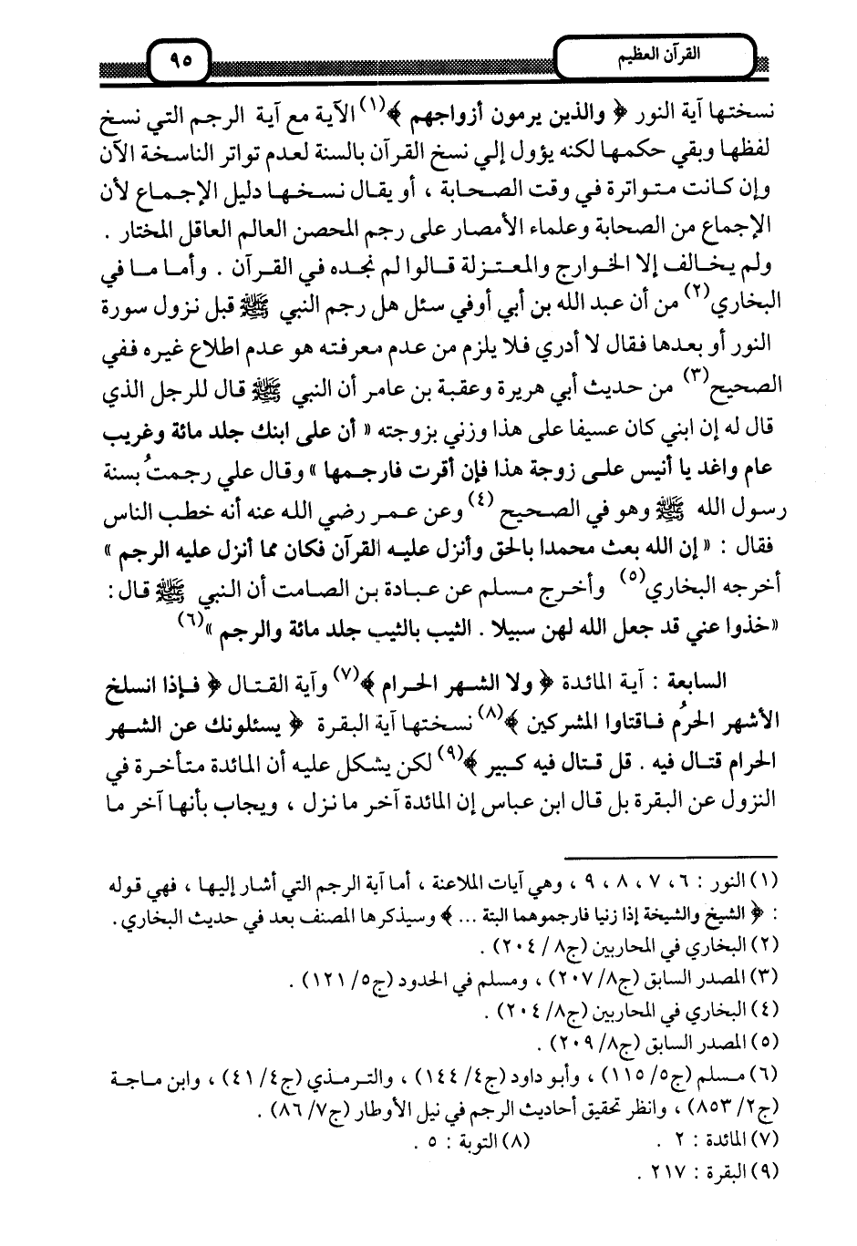 السابعة: آية المائدة: {وَلَا الشَّهْرَ الْحَرَام} 7 وآية القتال: {فَإِذَا انْسَلَخَ الْأَشْهُرُ الْحُرُمُ فَاقْتُلُوا الْمُشْرِكِينَ} 8 نسختها آية البقرة: {يَسْأَلُونَكَ عَنِ الشَّهْرِ الْحَرَامِ قِتَالٍ فِيهِ قُلْ قِتَالٌ فِيهِ كَبِيرٌ} 9, لكن يشكل عليه أن المائدة متأخرة في النزول عن البقرة, بل قال ابن عباس: إن المائدة آخر ما نزل، ويجاب بأنها آخر ما