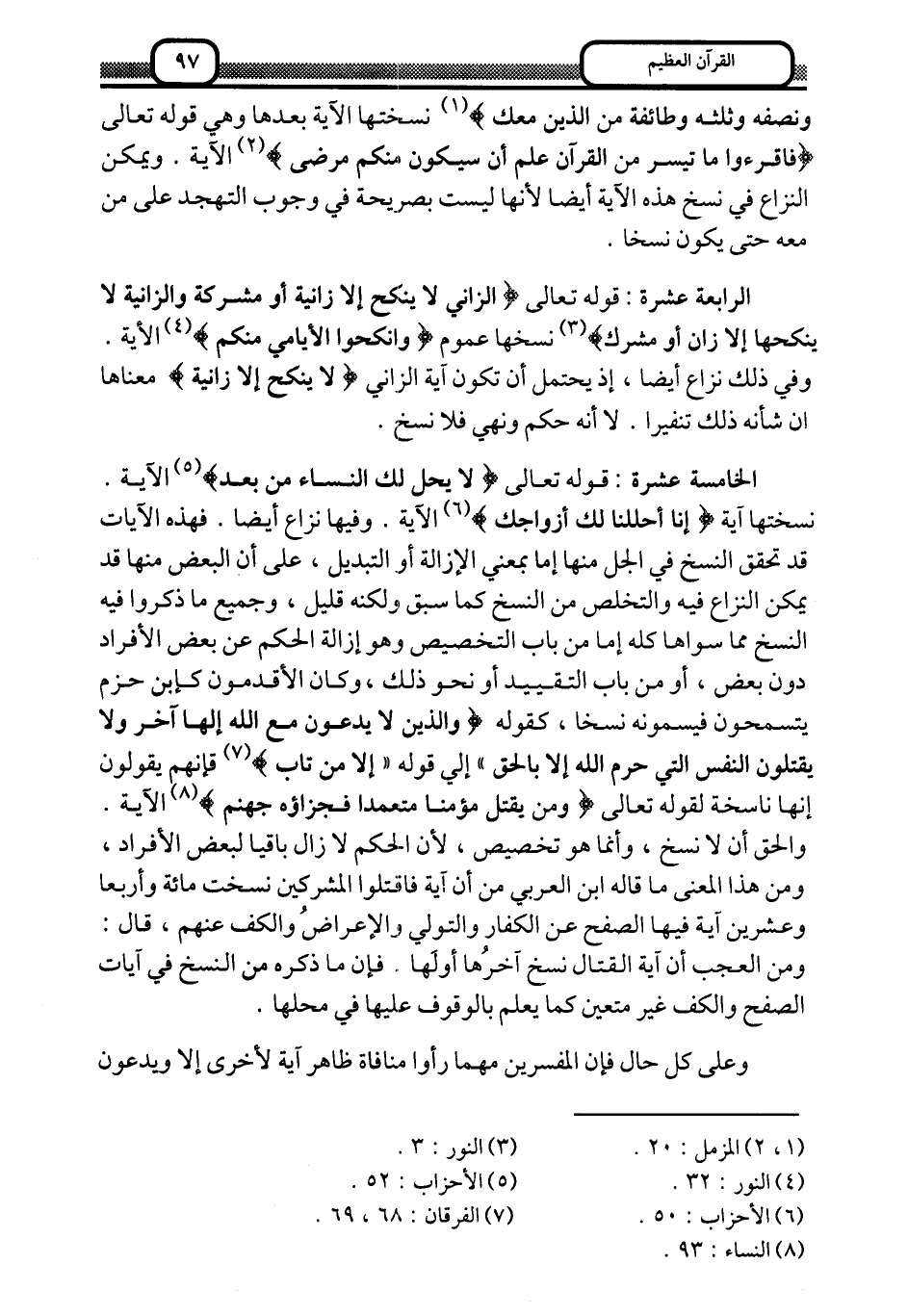 نسختها آية: {إِنَّا أَحْلَلْنَا لَكَ أَزْوَاجَكَ} 6 الآية, وفيها نزاع أيضًا, فهذه الآيات قد تحقَّق النسخ في الجل منها إما بمعنى الإزالة أو التبديل، على أن البعض منها قد يمكن النزاع فيه والتخلص من النسخ كما سبق ولكنه قليل، وجميع ما ذكروا فيه النسخ مما سواه كله, إما من باب التخصيص, وهو إزالة الحكم عن بعض الأفراد دون بعض، أو من باب التقييد أو نحو ذلك، وكان الأقدمون كابن حزم يتسمحون فيسمونه نسخًا، كقوله: {وَالَّذِينَ لا يَدْعُونَ مَعَ اللَّهِ إِلَهًا آخَرَ وَلا يَقْتُلُونَ النَّفْسَ الَّتِي حَرَّمَ اللَّهُ إِلَّا بِالْحَقِّ} إلى قوله: {إِلَّا مَنْ تَاب} 7 فإنهم يقولون: إنها ناسخة قوله تعالى: {وَمَنْ يَقْتُلْ مُؤْمِنًا مُتَعَمِّدًا فَجَزَاؤُهُ جَهَنَّمُ} 8 الآية.