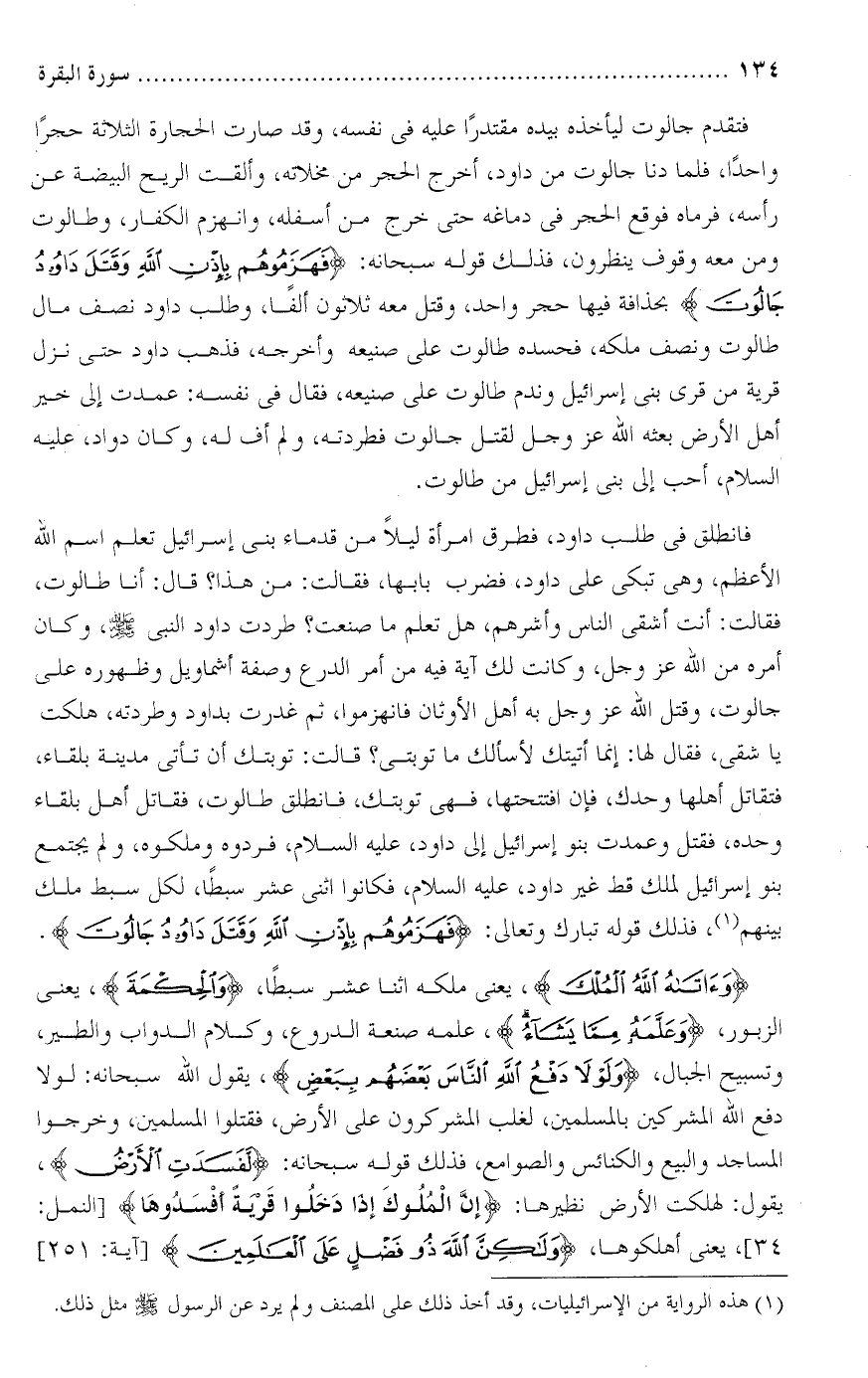 ومن معه وقوف ينظرون ، فذلك قوله سبحانه : ( فهزموهم بإذن الله وقتل داود جالوت ( بحذافة فيها حجر واحد ، وقتل معه ثلاثون ألفا ، وطلب داود نصف مال