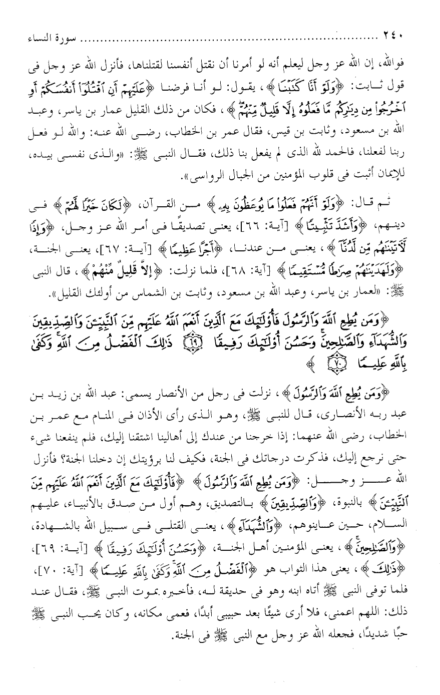 ) ولهديناهم صراطا مستقيما ) [ آية : 68 ] ، فلما نزلت : ( إلا قليل منهم ( ، قال النبي