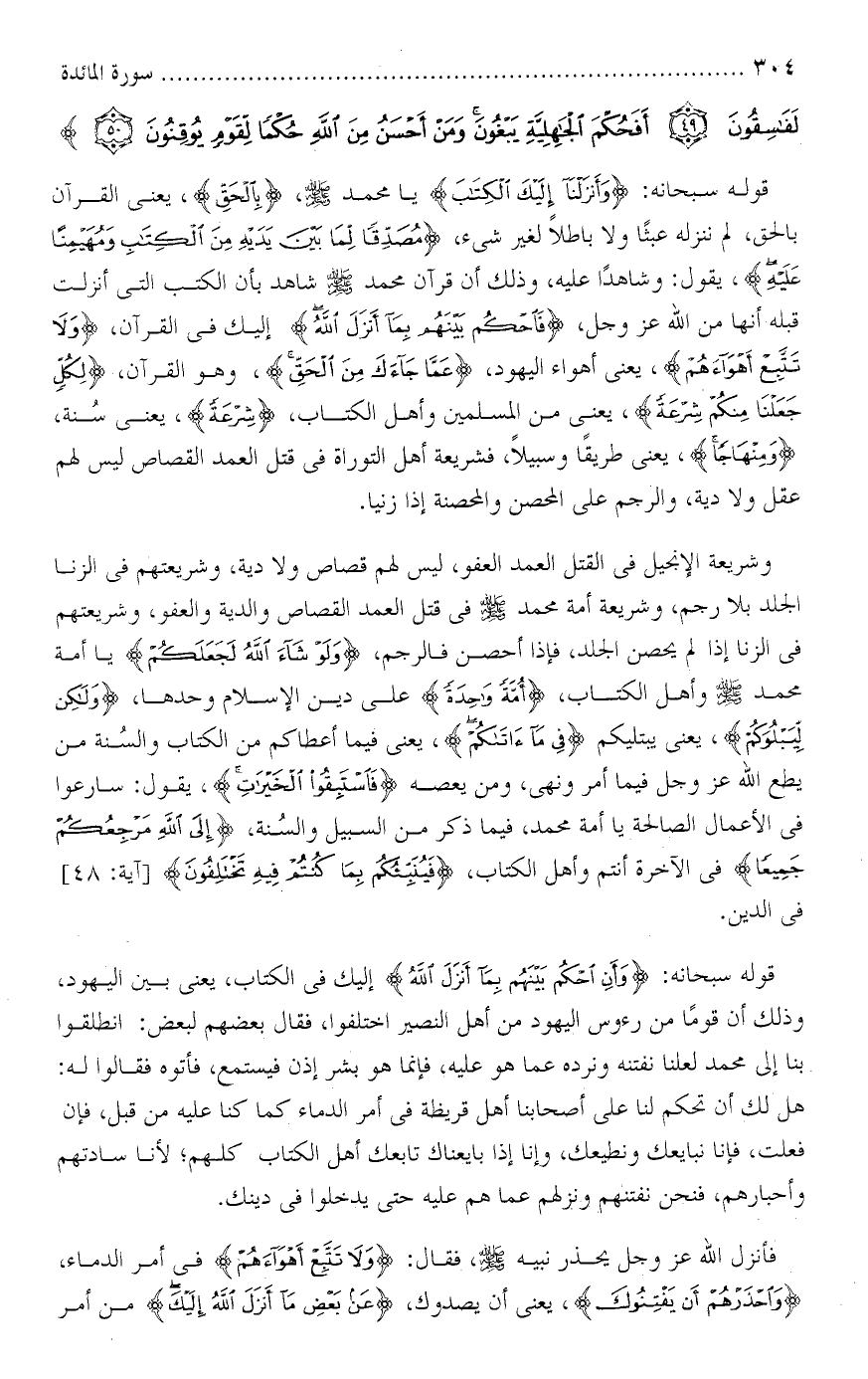 قبله أنها من الله عز وجل ، ) فاحكم بينهم بما أنزل الله ( إليك في القرآن ، ) ولا تتبع أهواءهم ( ، يعني أهواء اليهود ، ) عما جاءك من الحق ( ، وهو القرآن ، ) لكل جعلنا منكم شرعة ( ، يعني من المسلمين وأهل الكتاب ، ) شرعة ( ، يعني سنة ،