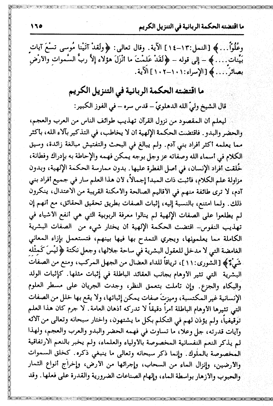 ليعلم أن المقصود من نزول القرآن تهذيب طوائف الناس من العرب والعجم، والحضر والبدو. فاقتضت الحكمة الإلهية أن لا يخاطب، في التذكير بآلاء الله، بأكثر مما يعلمه أكثر أفراد بني آدم. ولم يبالغ في البحث والتفتيش مبالغة زائدة، وسيق الكلام في أسماء الله وصفاته عز وجل بوجه يمكن فهمه والإحاطة به بإدراك وفطانة، خلقت أفراد الإنسان، في أصل الفطرة عليها. بدون ممارسة الحكمة الإلهية، وبدون مزاولة علم الكلام، فأثبت ذات المبدأ إجمالا، لأن هذا العلم سار في جميع أفراد بني آدم، لا ترى طائفة منهم في الأقاليم الصالحة والأمكنة القريبة من الاعتدال، ينكرون ذلك. ولما امتنع، بالنسبة إليه، إثبات الصفات بطريق تحقيق الحقائق، مع أنهم إن لم يطلعوا على الصفات الإلهية لم ينالوا معرفة الربوبية التي هي أنفع الأشياء في تهذيب النفوس- اقتضت الحكمة الإلهية أن يختار شيء من الصفات البشرية الكاملة مما يعلمونها، ويجري التمدح بها فيها بينهم، فتستعمل بإزاء المعاني الغامضة التي لا مدخل للعقول البشرية في ساحة جلالها، وجعل نكتة لَيْسَ كَمِثْلِهِ شَيْءٌ [الشورى: 11] ، ترياقا للداء العضال من الجهل المركب، ومنع من الصفات البشرية التي تثير الأوهام بجانب العقائد الباطلة في إثبات مثلها. كإثبات الولد والبكاء والجزع. وإن تأملت بتعمق النظر، وجدت الجريان على مسطر العلوم الإنسانية غير المكتسبة، وميزت صفات يمكن إثباتها، ولا يقع بها خلل من الصفات التي تثيرها الأوهام الباطلة أمرا دقيقا لا تدركه أذهان العامة. لا جرم كان هذا العلم توقيفيا، ولم يؤذن لهم في التكلم بكل ما يشتهون، واختار سبحانه وتعالى من آلائه وآيات قدرته، جل وعلا، ما تساوت في فهمه الحضر والبدو والعرب والعجم، ولهذا لم يذكر النعم النفسانية المخصوصة بالأولياء والعلماء، ولم يخبر بالنعم الارتفاقية المخصوصة بالملوك. وإنما ذكر سبحانه وتعالى ما ينبغي ذكره. كخلق السموات والأرضين، وإنزال الماء من السحاب، وإجرائها من الأرض، وإخراج أنواع الثمار والحبوب والأزهار بواسطة الماء، وإلهام الصناعات الضرورية والقدرة على فعلها. وقد