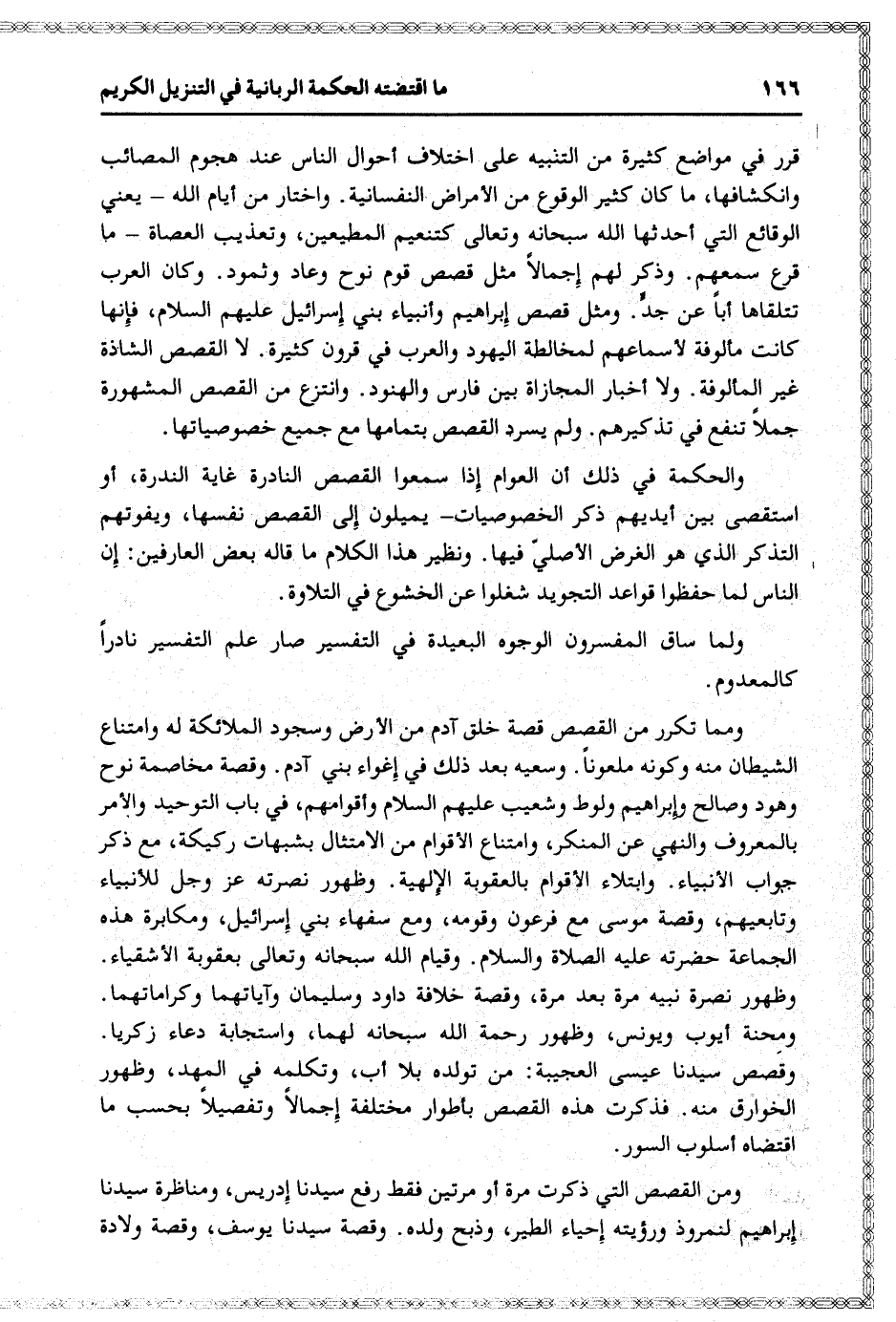 والحكمة في ذلك أن العوام إذا سمعوا القصص النادرة غاية الندرة، أو استقصى بين أيديهم ذكر الخصوصيات- يميلون إلى القصص نفسها، ويفوتهم التذكر الذي هو الغرض الأصليّ فيها. ونظير هذا الكلام ما قاله بعض العارفين: إن الناس لما حفظوا قواعد التجويد شغلوا عن الخشوع في التلاوة.