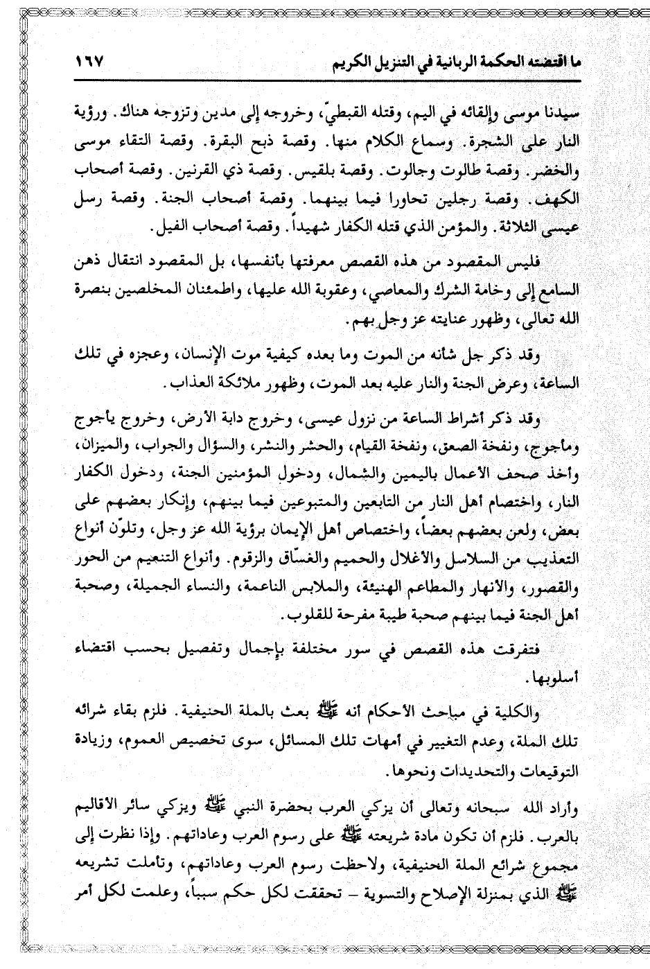 وقد ذكر أشراط الساعة من نزول عيسى، وخروج دابة الأرض، وخروج يأجوج ومأجوج، ونفخة الصعق، ونفخة القيام، والحشر والنشر، والسؤال والجواب، والميزان، وأخذ صحف الأعمال باليمين والشمال، ودخول المؤمنين الجنة، ودخول الكفار النار، واختصام أهل النار من التابعين والمتبوعين فيما بينهم، وإنكار بعضهم على بعض، ولعن بعضهم بعضا، واختصاص أهل الإيمان برؤية الله عز وجل، وتلوّن أنواع التعذيب من السلاسل والأغلال والحميم والغسّاق والزقوم. وأنواع التنعيم من الحور والقصور، والأنهار والمطاعم الهنيئة، والملابس الناعمة، والنساء الجميلة، وصحبة أهل الجنة فيما بينهم صحبة طيبة مفرحة للقلوب.