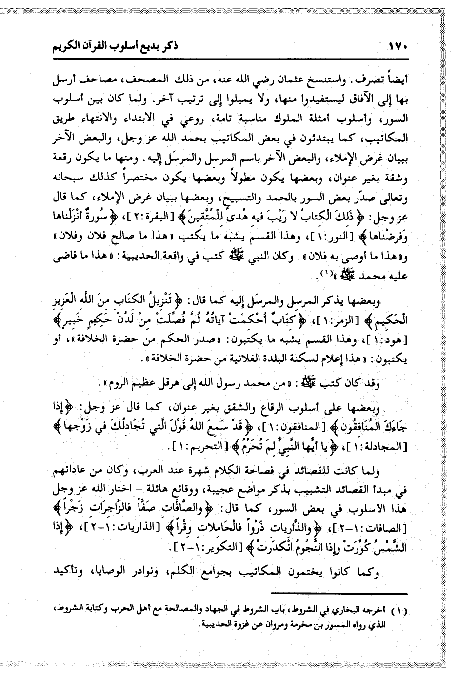 أيضا تصرف. واستنسخ عثمان رضي الله عنه، من ذلك المصحف، مصاحف أرسل بها إلى الآفاق ليستفيدوا منها، ولا يميلوا إلى ترتيب آخر. ولما كان بين أسلوب السور، وأسلوب أمثلة الملوك مناسبة تامة، روعي في الابتداء والانتهاء طريق المكاتيب، كما يبتدئون في بعض المكاتيب بحمد الله عز وجل، والبعض الآخر ببيان غرض الإملاء، والبعض الآخر باسم المرسل والمرسل إليه. ومنها ما يكون رقعة وشقة بغير عنوان، وبعضها يكون مطولا وبعضها يكون مختصرا كذلك سبحانه وتعالى صدّر بعض السور بالحمد والتسبيح، وبعضها ببيان غرض الإملاء، كما قال عز وجل: ذلِكَ الْكِتابُ لا رَيْبَ فِيهِ هُدىً لِلْمُتَّقِينَ [البقرة: 2] ، سُورَةٌ أَنْزَلْناها وَفَرَضْناها [النور: 1] ، وهذا القسم يشبه ما يكتب «هذا ما صالح فلان وفلان» و «هذا ما أوصى به فلان» .