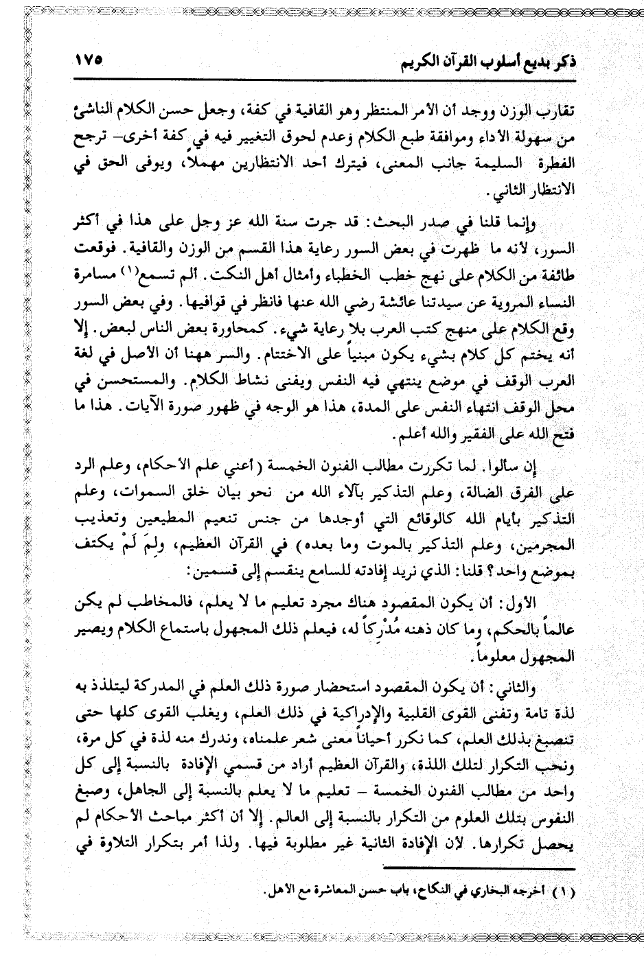 والثاني: أن يكون المقصود استحضار صورة ذلك العلم في المدركة ليتلذذ به لذة تامة وتفنى القوى القلبية والإدراكية في ذلك العلم، ويغلب القوى كلها حتى تنصبغ بذلك العلم، كما نكرر أحيانا معنى شعر علمناه، وندرك منه لذة في كل مرة، ونحب التكرار لتلك اللذة، والقرآن العظيم أراد من قسمي الإفادة بالنسبة إلى كل واحد من مطالب الفنون الخمسة- تعليم ما لا يعلم بالنسبة إلى الجاهل، وصبغ النفوس بتلك العلوم من التكرار بالنسبة إلى العالم. إلا أن أكثر مباحث الأحكام لم يحصل تكرارها. لأن الإفادة الثانية غير مطلوبة فيها. ولذا أمر بتكرار التلاوة في