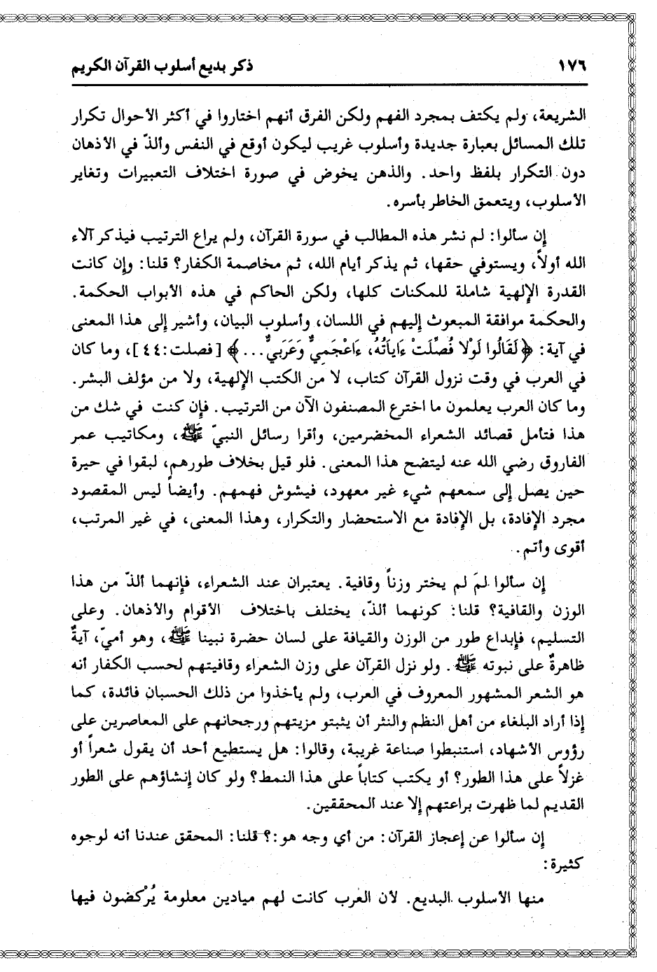 إن سألوا لمَ لم يختر وزنا وقافية. يعتبران عند الشعراء، فإنهما ألذّ من هذا الوزن والقافية؟ قلنا: كونهما ألذّ، يختلف باختلاف الأقوام والأذهان. وعلى التسليم، فإبداع طور من الوزن والقيافة على لسان حضرة نبينا صلّى الله عليه وسلّم، وهو أميّ، آية ظاهرة على نبوته صلّى الله عليه وسلّم. ولو نزل القرآن على وزن الشعراء وقافيتهم لحسب الكفار أنه هو الشعر المشهور المعروف في العرب، ولم يأخذوا من ذلك الحسبان فائدة، كما إذا أراد البلغاء من أهل النظم والنثر أن يثبتوا مزيتهم ورجحانهم على المعاصرين على رؤوس الأشهاد، استنبطوا صناعة غريبة، وقالوا: هل يستطيع أحد أن يقول شعرا أو غزلا على هذا الطور؟ أو يكتب كتابا على هذا النمط؟ ولو كان إنشاؤهم على الطور القديم لما ظهرت براعتهم إلا عند المحققين.