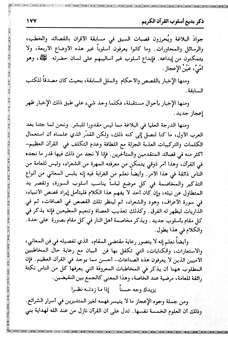 جواد البلاغة ويحرزون قصبات السبق في مسابقة الأقران بالقصائد والخطب، والرسائل والمحاورات. وما كانوا يعرفون أسلوبا غير هذه الأوضاع الأربعة، ولا يتمكنون من إبداعه. فإبداع أسلوب غير أساليبهم على لسان حضرته صلّى الله عليه وسلّم، وهو أمّيّ، عين الإعجاز.