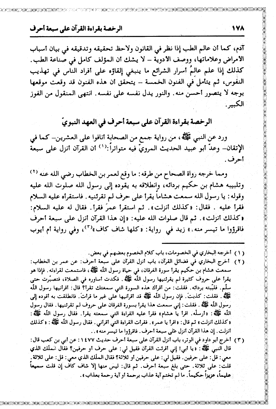 أخرج البخاري في فضائل القرآن، باب أنزل القرآن على سبعة أحرف: عن عمر بن الخطاب: سمعت هشام بن حكيم يقرأ سورة الفرقان، في حياة رسول الله صلّى الله عليه وسلّم، فاستمعت لقراءته. فإذا هو يقرأ على حروف كثيرة لم يقرئنيها رسول الله صلّى الله عليه وسلّم. فكدت أساوره في الصلاة، فتصبّرت حتى سلّم. فلبّبته بردائه. فقلت: من أقرأك هذه السورة التي سمعتك تقرأ؟ قال: أقرأنيها رسول الله صلّى الله عليه وسلّم. فقلت: كذبت. فإن رسول الله صلّى الله عليه وسلّم قد أقرأنيها على غير ما قرأت. فانطلقت به أقوده إلى رسول الله صلّى الله عليه وسلّم. فقلت: إني سمعت هذا يقرأ بسورة الفرقان على حروف لم تقرئنيها. فقال رسول الله صلّى الله عليه وسلّم: «أرسله. اقرأ يا هشام» فقرأ عليه القراءة التي سمعته يقرأ. فقال رسول الله صلّى الله عليه وسلّم: