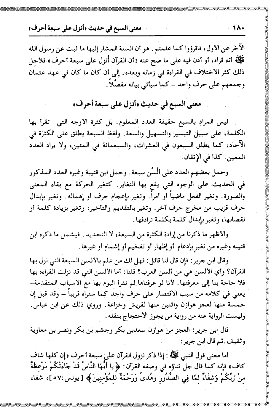 وحمل بعضهم العدد على ألسن سبعة. وحمل ابن قتيبة وغيره العدد المذكور في الحديث على الوجوه التي يقع بها التغاير. كتغير الحركة مع بقاء المعنى والصورة. وتغير الفعل ماضيا أو أمرا. وتغير بإعجام حرف أو إهماله. وتغير بإبدال حرف قريب من مخرج حرف آخر. وتغير بالتقديم والتأخير، وتغير بزيادة كلمة أو نقصانها، وتغير بإبدال كلمة بكلمة ترادفها.