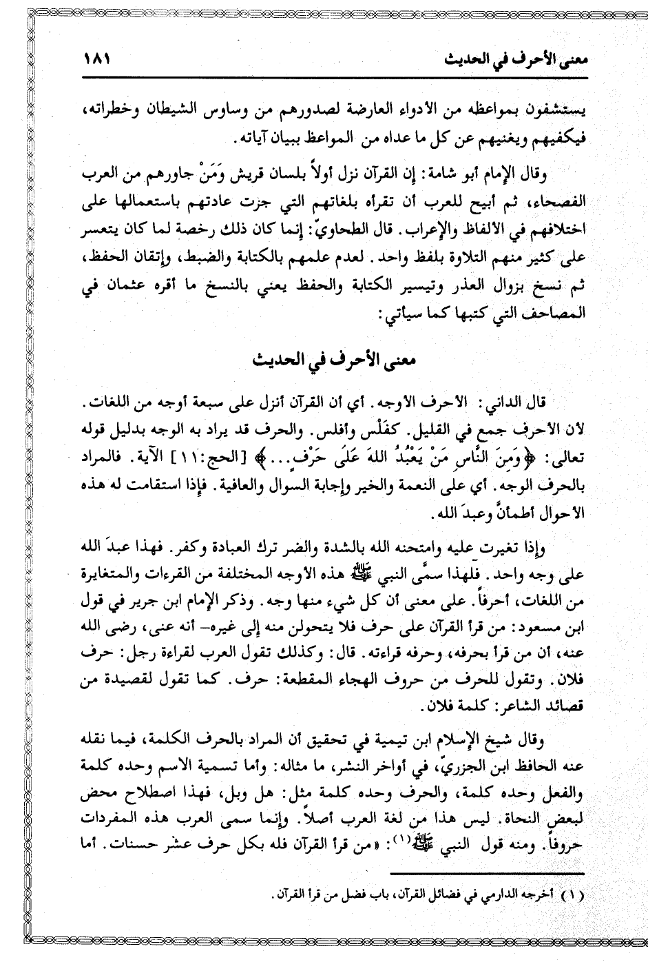 وقال شيخ الإسلام ابن تيمية في تحقيق أن المراد بالحرف الكلمة، فيما نقله عنه الحافظ ابن الجزريّ، في أواخر النشر، ما مثاله: وأما تسمية الاسم وحده كلمة والفعل وحده كلمة، والحرف وحده كلمة مثل: هل وبل، فهذا اصطلاح محض لبعض النحاة. ليس هذا من لغة العرب أصلا. وإنما سمى العرب هذه المفردات حروفا. ومنه